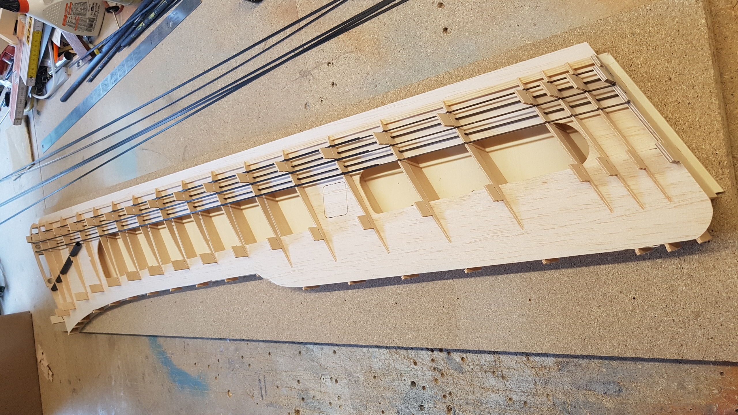 Füsse werde ich an die Oberseite setzten, wenn dann Holme und unter Beplankung drauf sind lässt sich die flache Unterseite bestimmt gut auf eine Helling auflegen um dann Verkastung usw einbauen zu können.