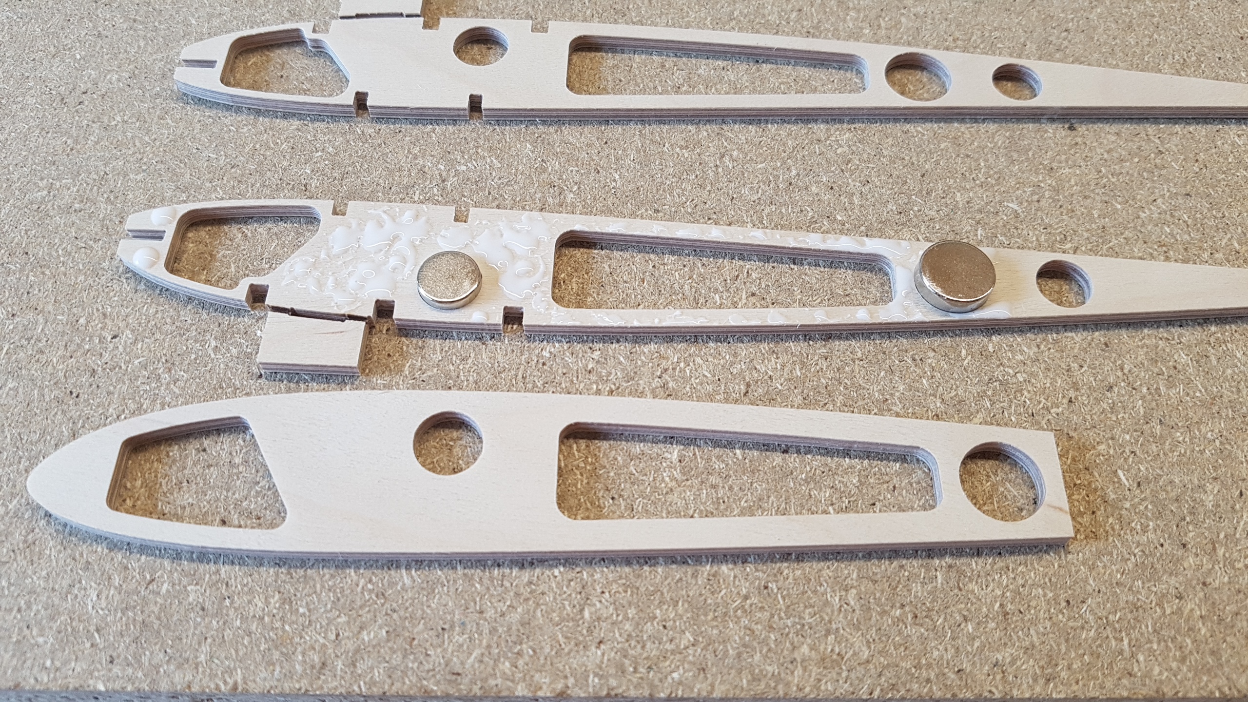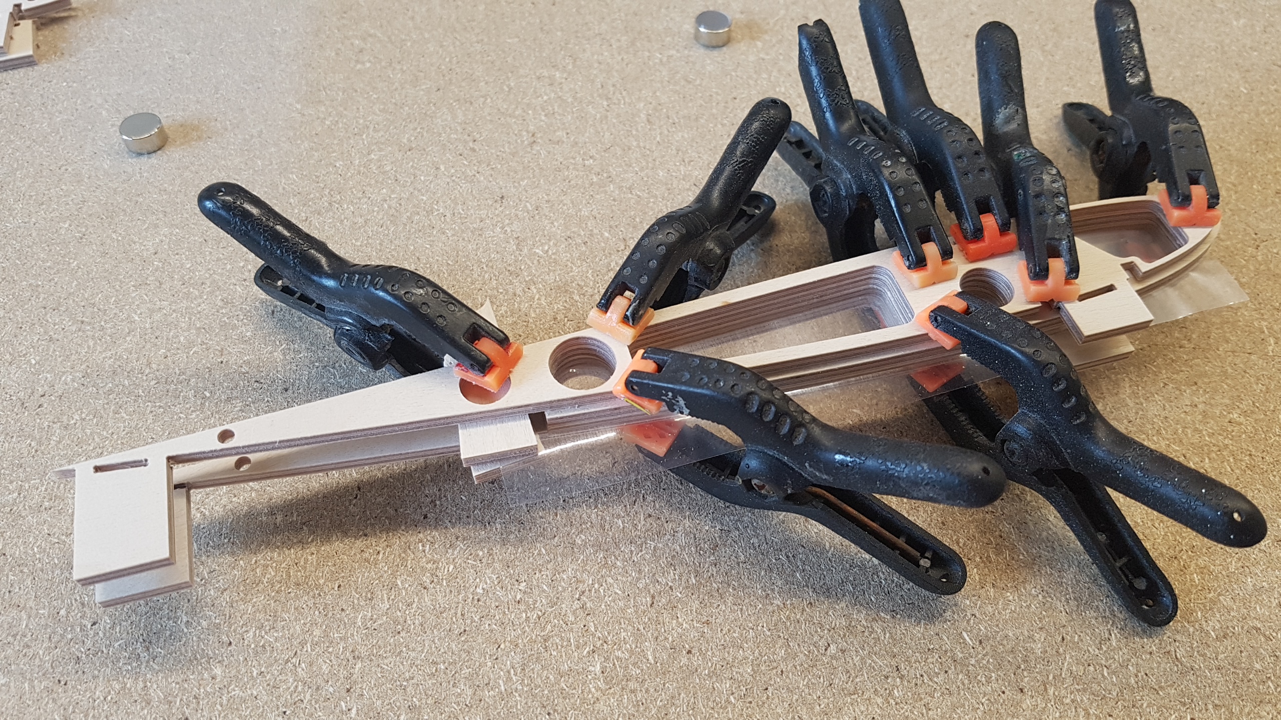 Zum Magnete einkleben werden die beiden Rippen mit einer Folie dazwischen zusammen geklammert, etwas 5min Epoxy in die Löcher und Magnete rein stecken sie ziehen sich dann zusammen und quetschen den überschüssigen Kleber heraus. Leider war ich dann etwas zu schnell bzw hab nicht mehr so ganz ans Bilder machen gedacht. :roll: