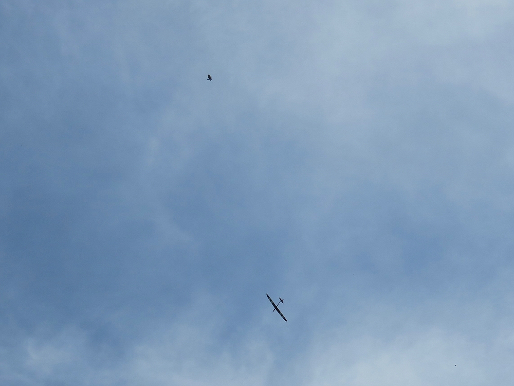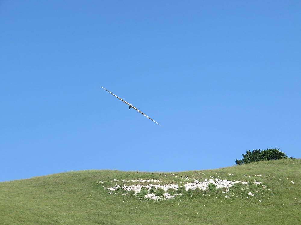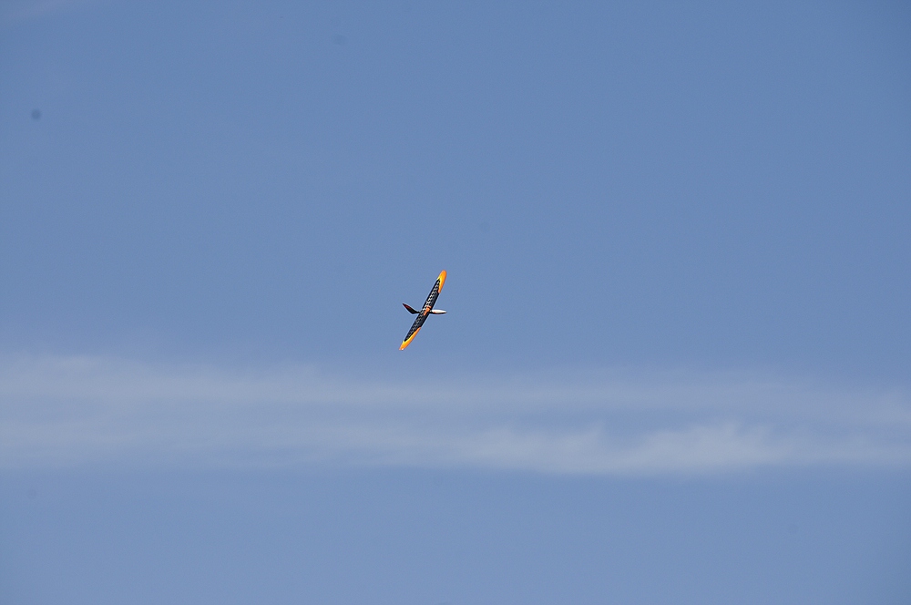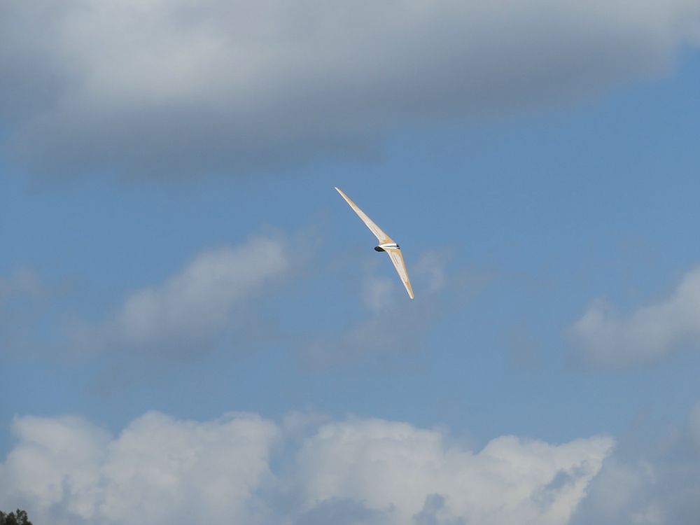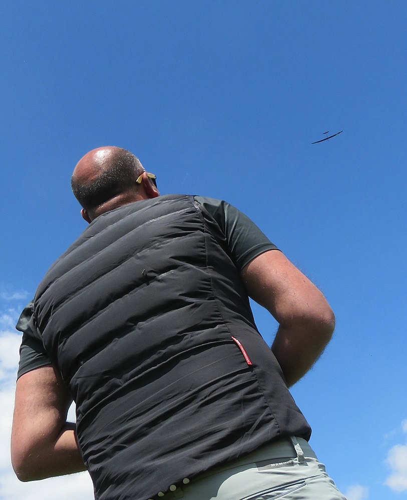 Am frühen Nachmittag mit weniger Wind und mehr Thermik machte die Luft die Flieger recht schnell, sogar die kleine 1,25 m Horten IX machte als PSS mehr Spaß als mit Impeller und durfte auch ein paar flotte DS-Runden drehen.