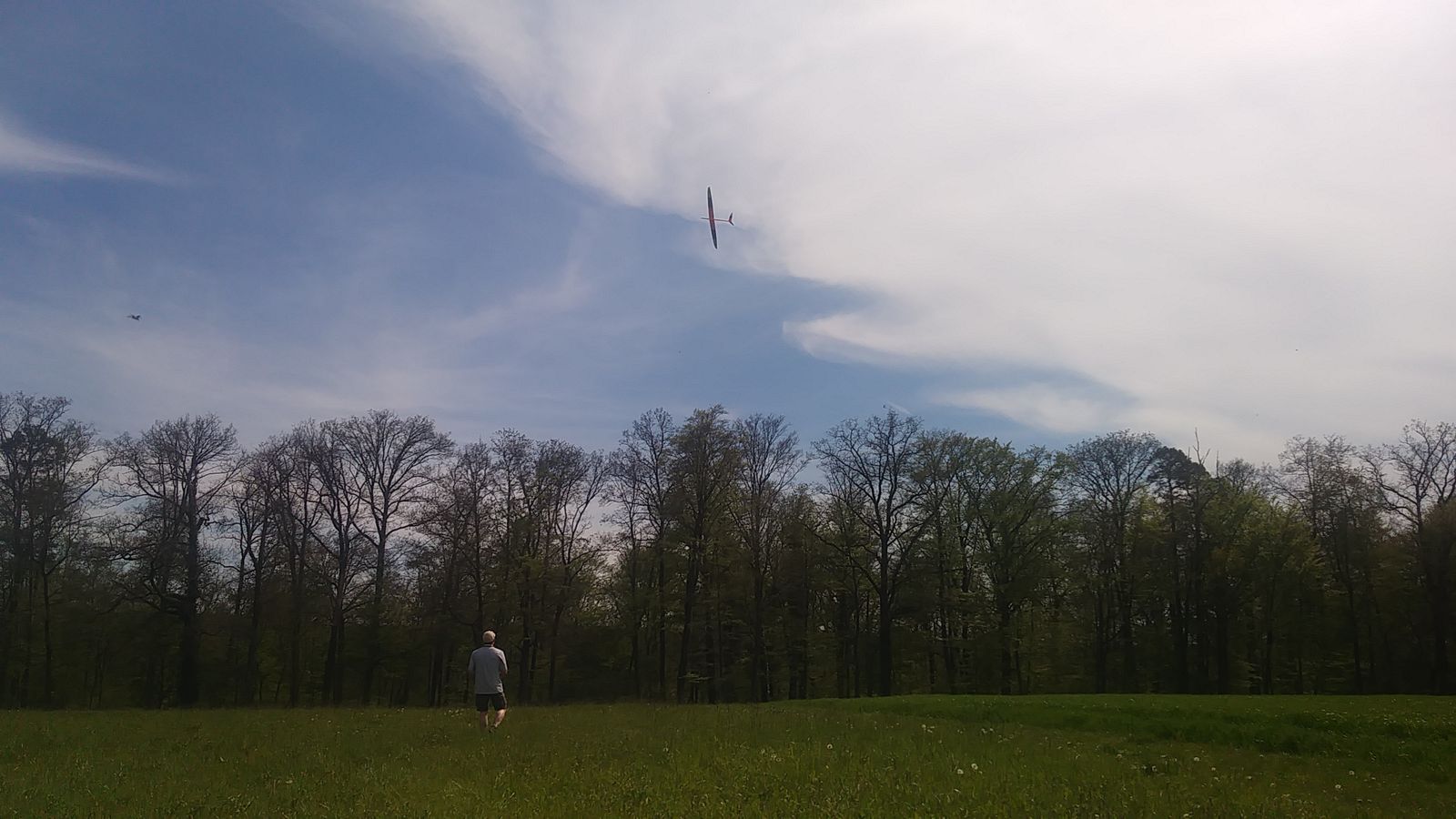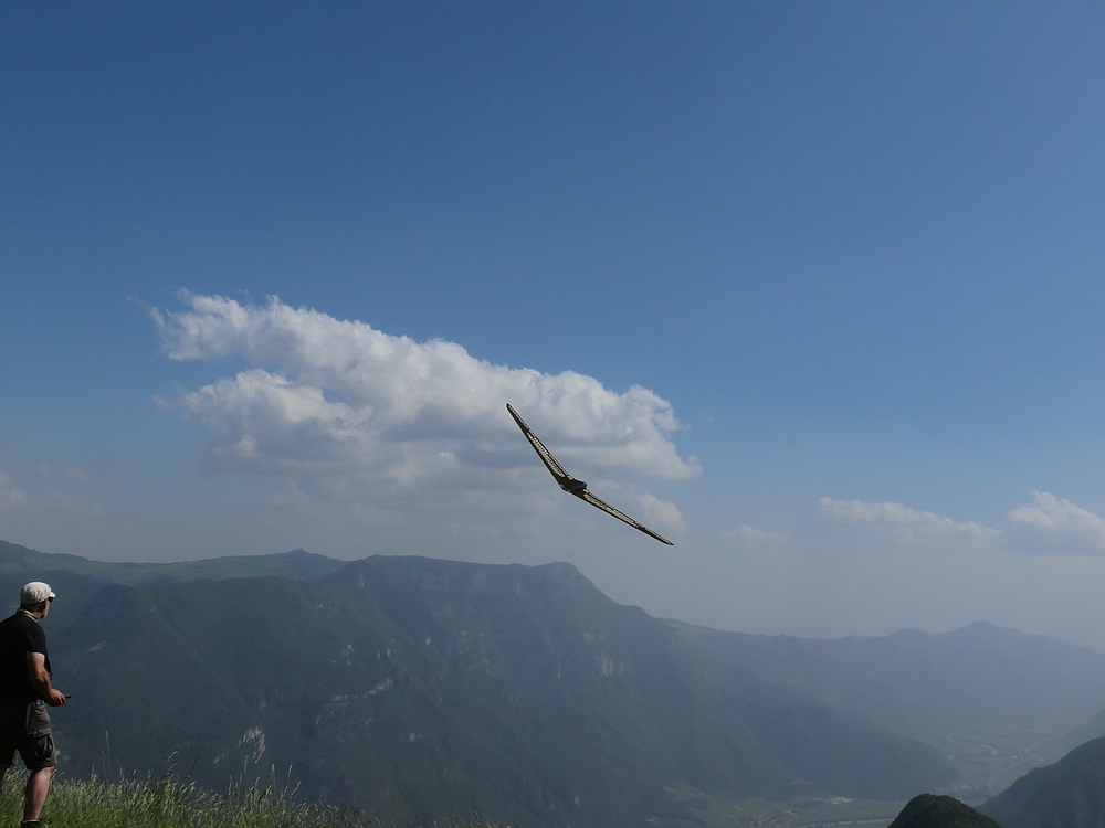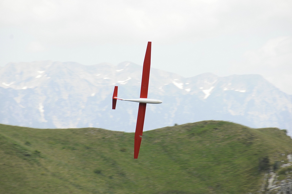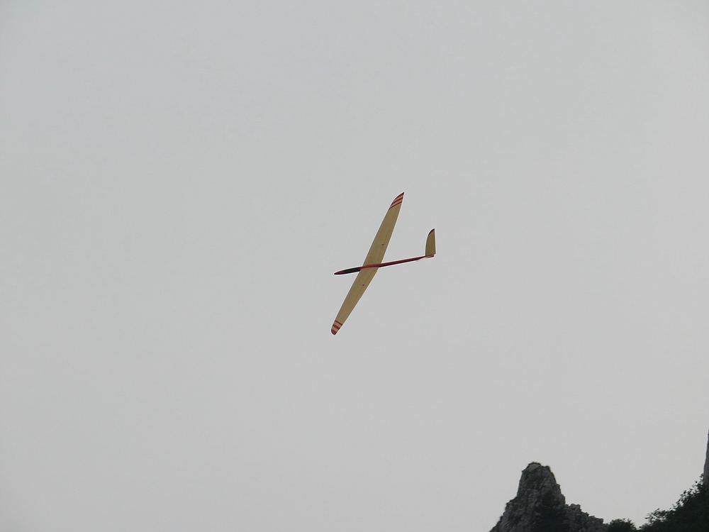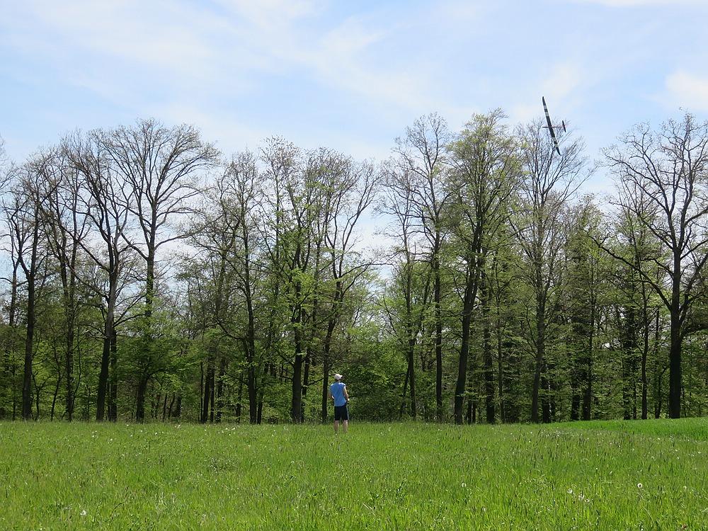 Am frühen Nachmittag mit weniger Wind und mehr Thermik machte die Luft die Flieger recht schnell, sogar die kleine 1,25 m Horten IX machte als PSS mehr Spaß als mit Impeller und durfte auch ein paar flotte DS-Runden drehen.