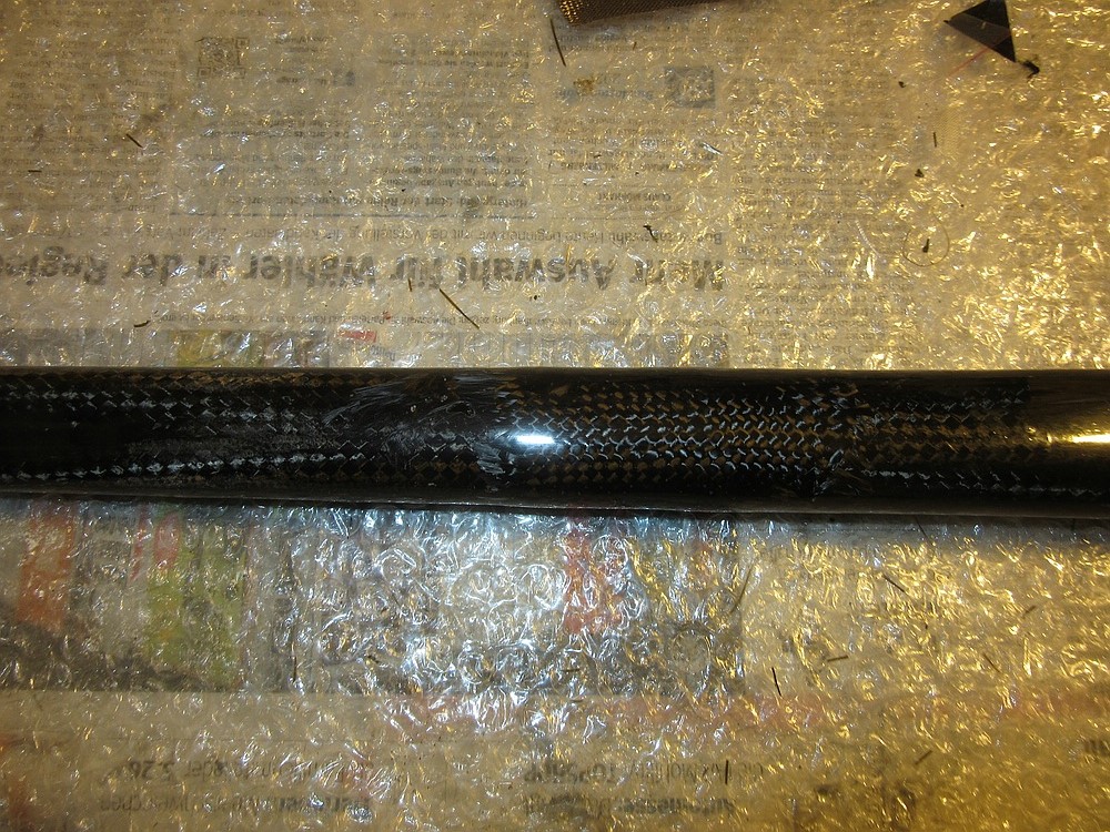 Bei Reparaturen von Sichtkohlerümpfen schneide ich die Gewebebandagen möglichst passgenau zu und laminiere sie sorgfältig mit leicht thixotropiertem Harz auf. Dann kommt ein Schrumpfschlauch drüber und die Reparaturstelle wird eingeschrumpft. Harz das sich aus den Enden des Schrumpfschlauchs drückt wird mit Spiritus und Küchenkrepp abgewischt.