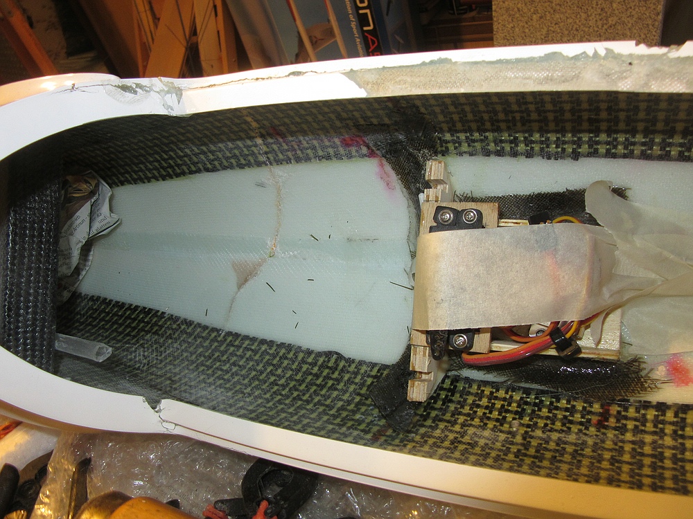 Im hohlen Verbinder habe ich die Bruchstelle durch Stücke eines alten, eingepassten Bruch-Vollkohleverbinders überbrückt und die Gurte mit ST UD-Gelege geschäftet.