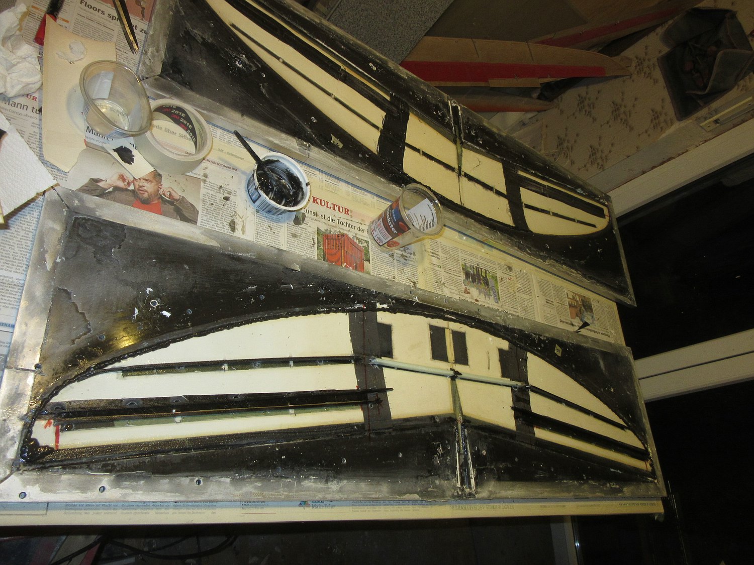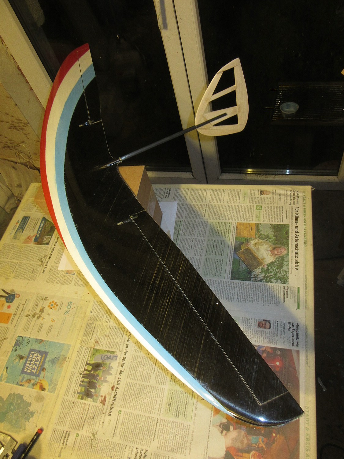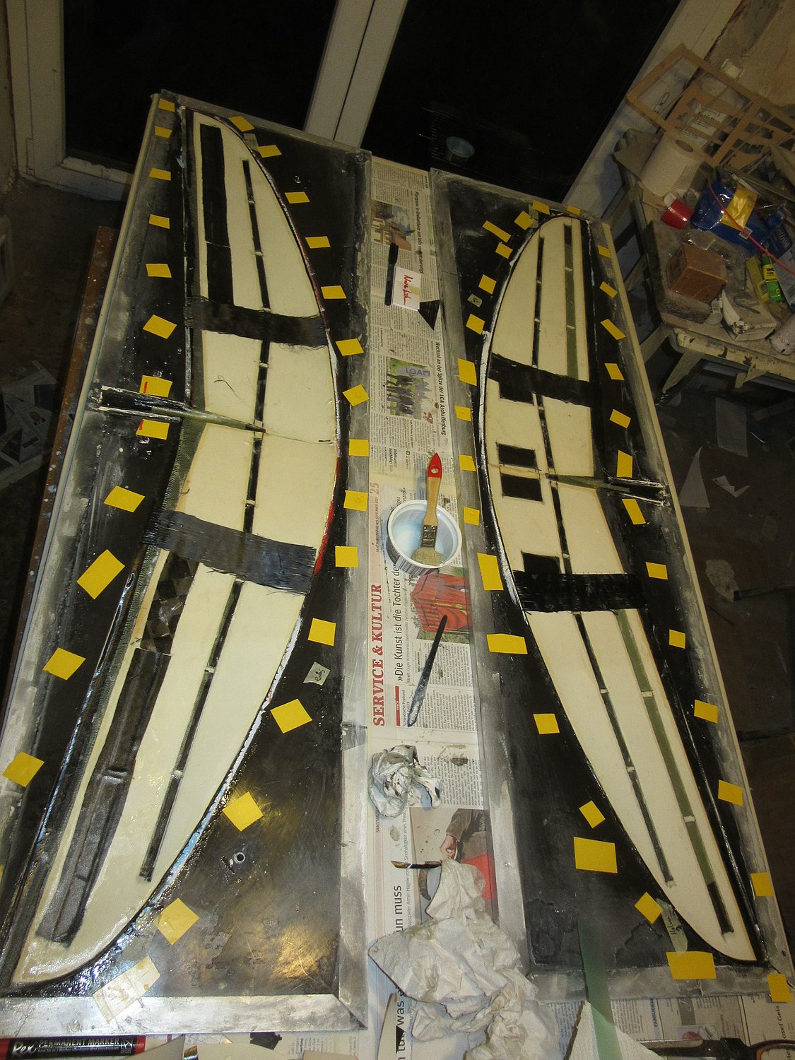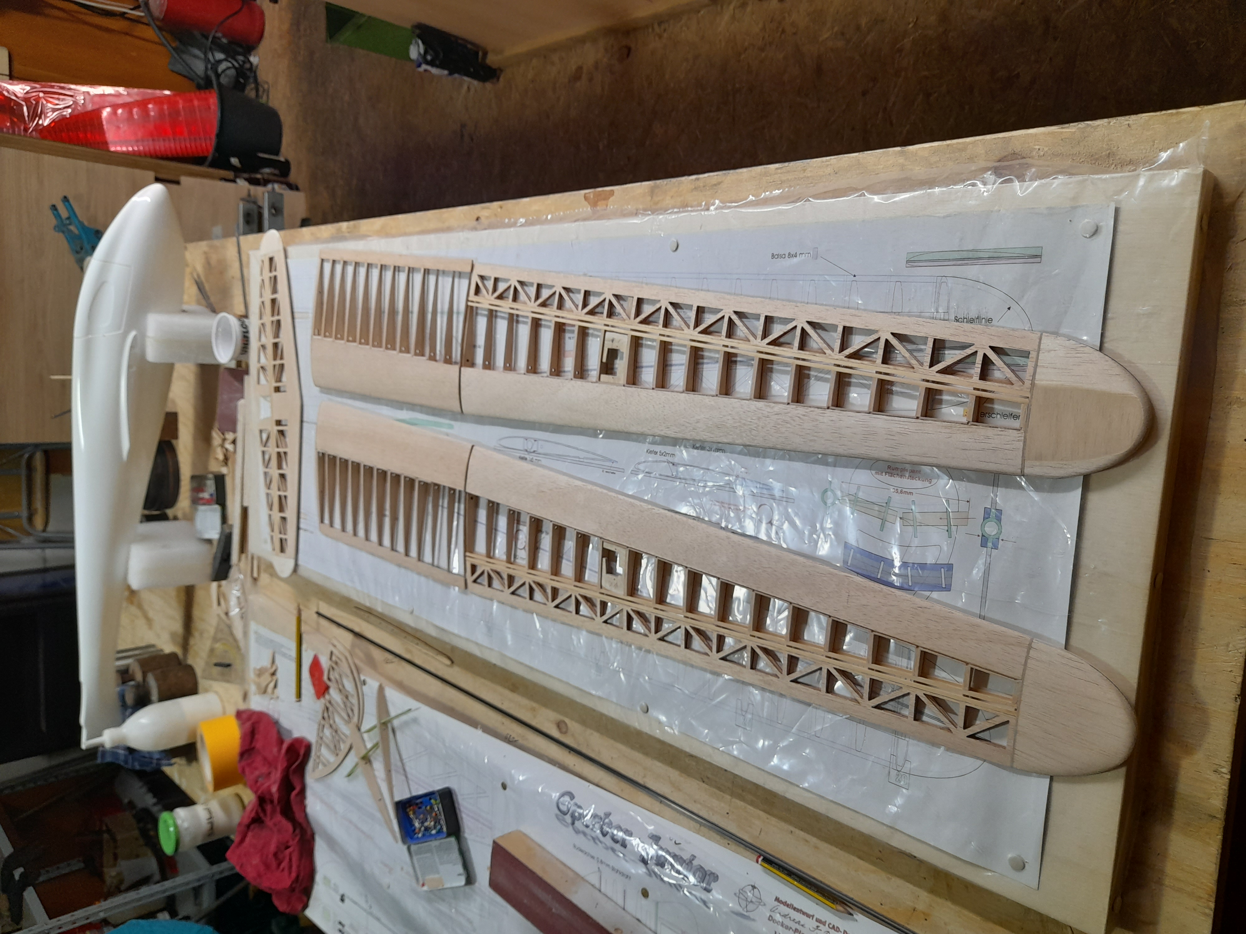 Die Außenflügel haben aktuell roh zusammen 560g, das ist wie ich finde ein echt guter Wert bei ~180cm Spannweite.