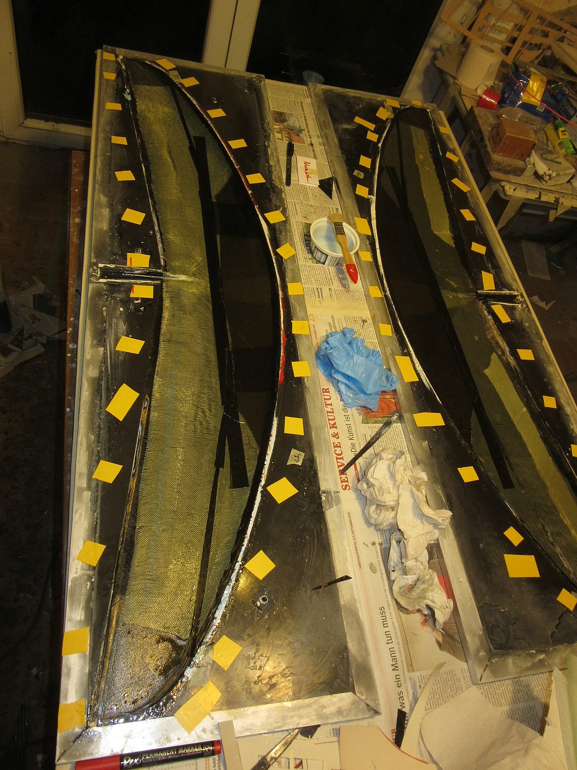 naja, wie konsequent mein Leichtbau ist wird nachher die Waage zeigen. Der rumpflose XBOW soll auch bei uns am Fels eingesetzt werden können ohne dass der kleinste Stein beim landen schon ein Loch im Flügel hinterlässt, deshalb ist unter der 30 g/m² Carboweave Außenlage noch eine Lage 30er Kevlar, die fürs fliegen auf einer normalen Wiese nicht benötigt wird. Die Innenlage ist 50er Glas.