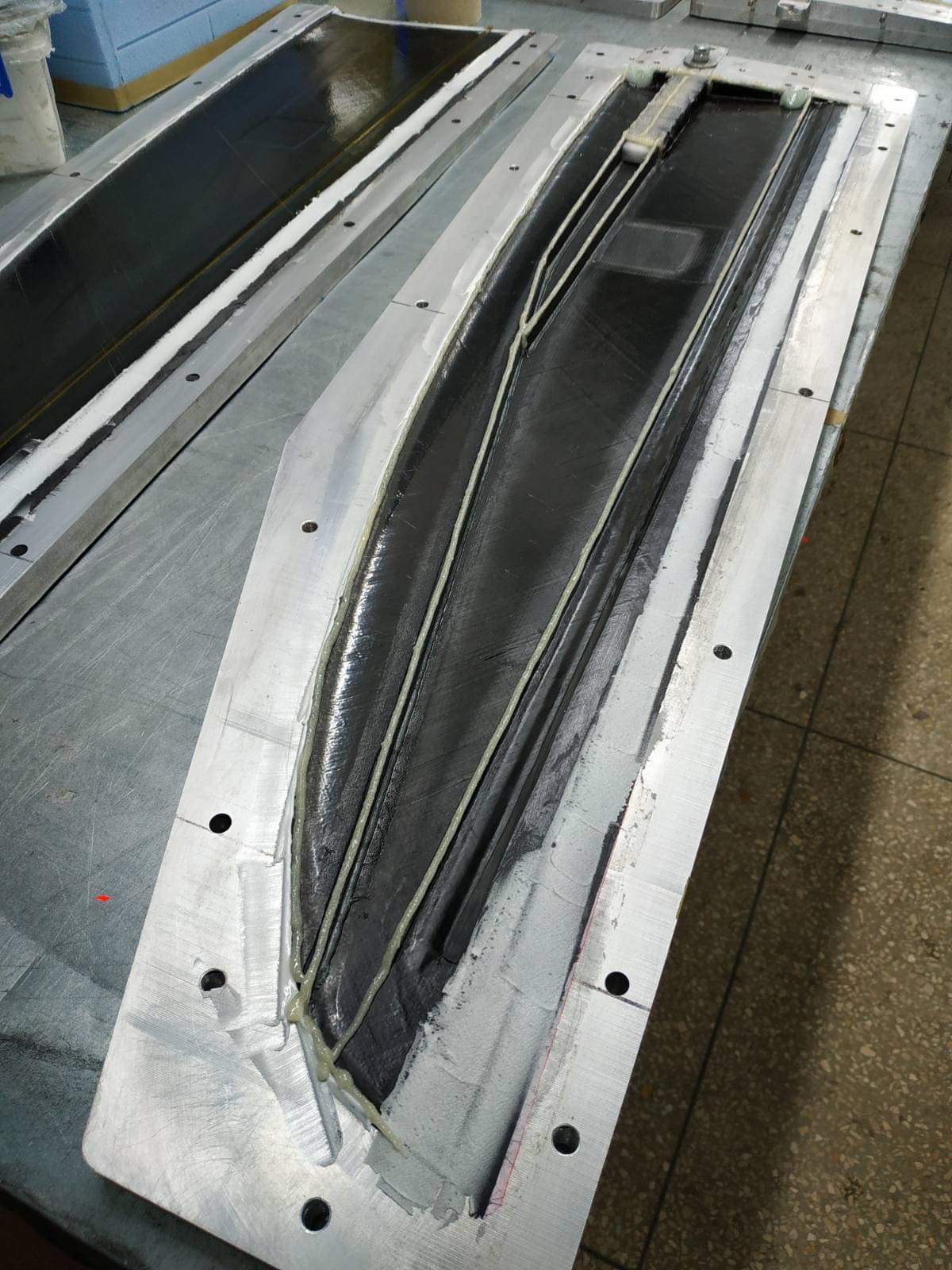 Der Nasenbereich im Mittelteil ist zusätzlich zur kevlarverstärkten DBox nochmal mit einer zweiten Lage Kevlar verstärkt...das sollte recht robust und trotzdem halbwegs leicht werden. Die Außenflügel haben eine doppelte Lage 80er Kohle in der D-Box für maximale Steifigkeit.