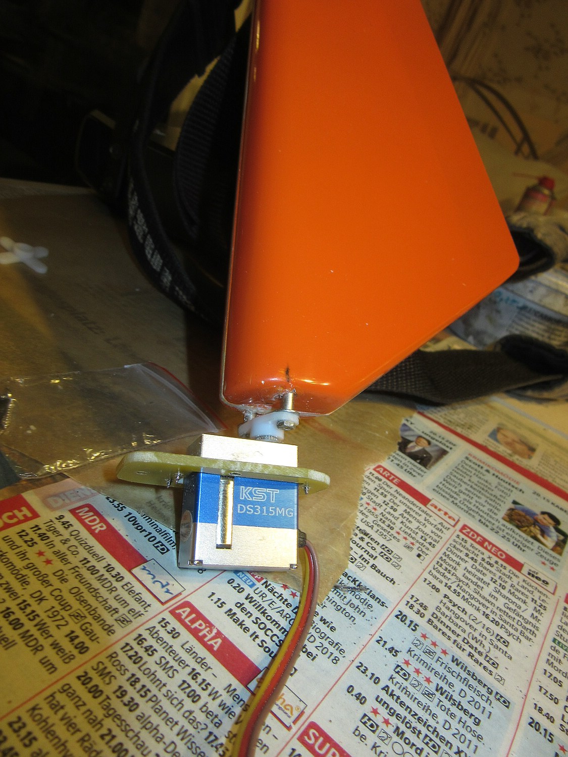 Wenn ich das richtig sehe, ist das Seitenleitwerk abnehmbar, wird nur auf die zwei Stifte im Servo gesteckt, oben dann klassisch mit Stahldraht gehalten.