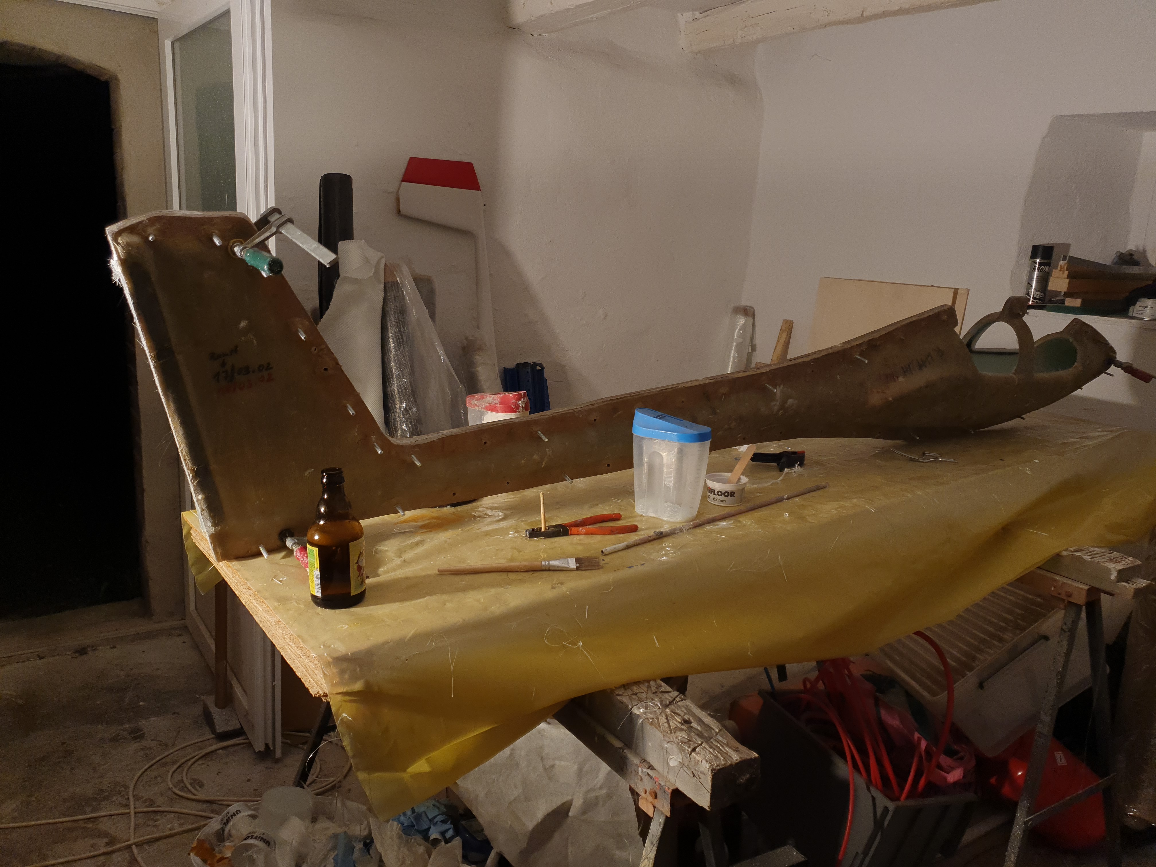eben alles bespannt, jetzt noch die Ruder anscharnieren, da möchte ich einen Tesa/Siikonmix machen.