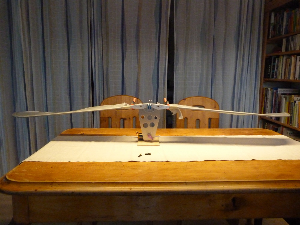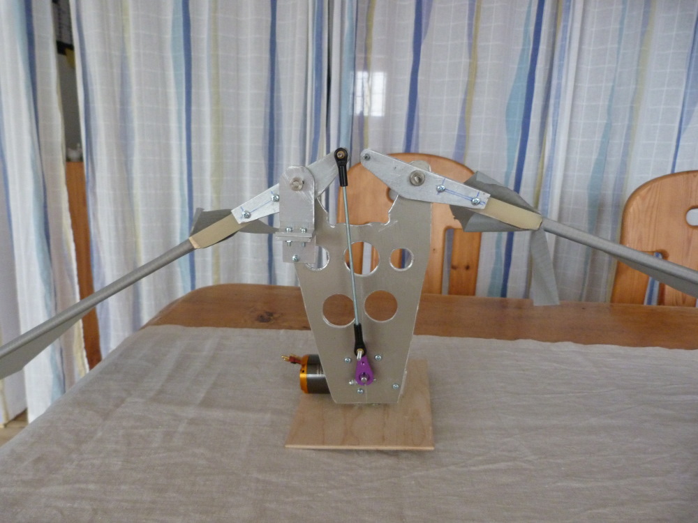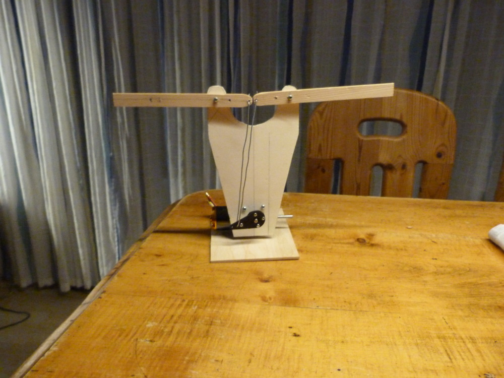 Doch noch eine Idee. Könnte es sein, dass deine starre Befestigung (am Hocker) die ganze Sache kaputt schwingt. Wenn der Flugapparat in der Luft ist würde er ja etwas "weicher" in seinem Element sein und die harten Schläge von dem gleichsinningen schwingen der Schwingen würden "in die Luft gehen".