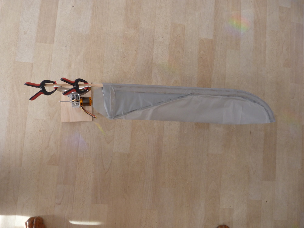 Ich habe die vordere Kante aus Kiefern und Eschen Leisten 0,5mm x 10mm lamelliert und in Form geschliffen, als Stahldraht 1,0mm verwendet und das Segel aus dem Böötchenshop mit Sekundenkleber befestigt. Mal sehen, ob das hält.