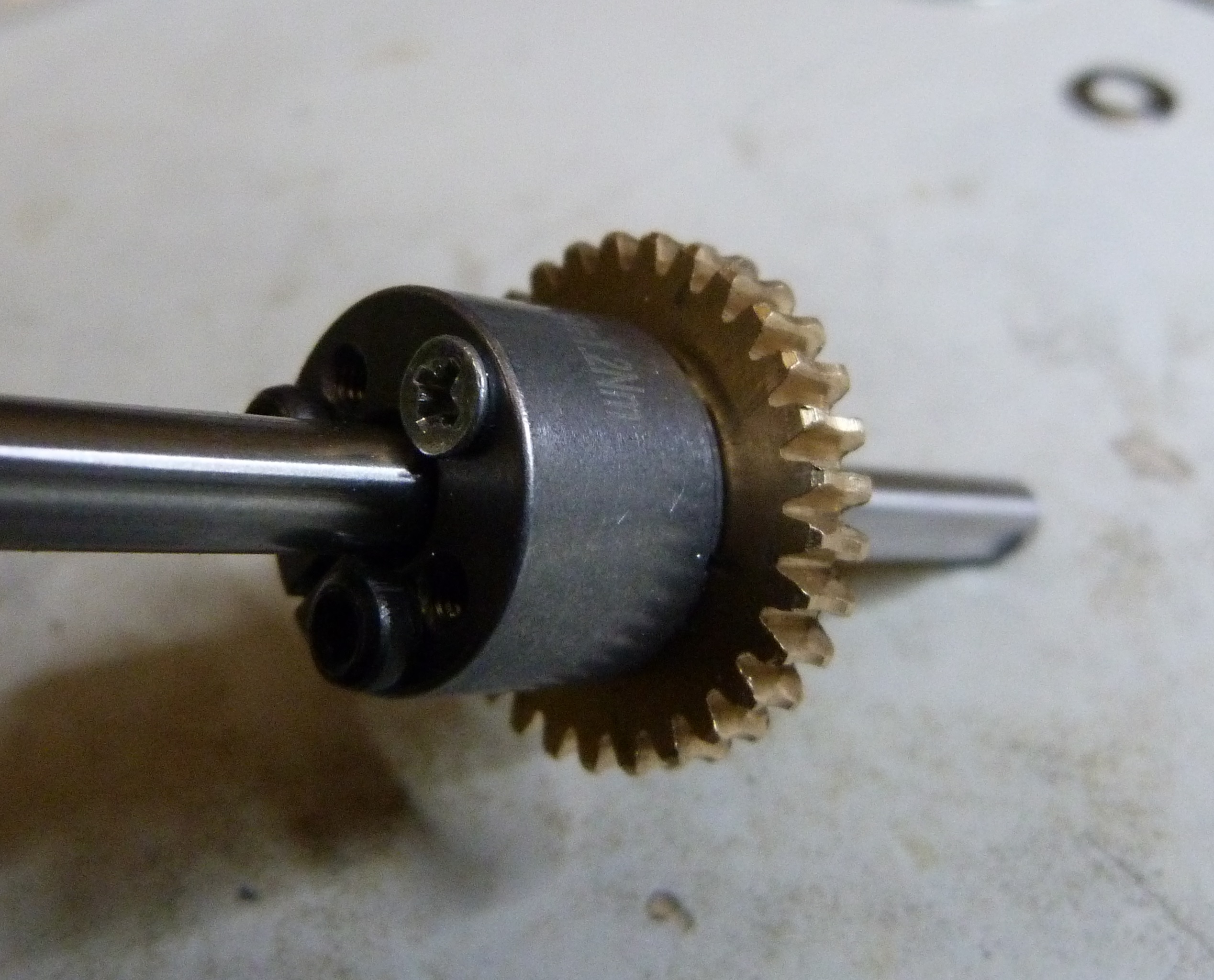 Das Zahnrad bekommt eine Madenschraube mit Abflachung auf der Welle und Verkeilung mit einem massiven Feststeller.