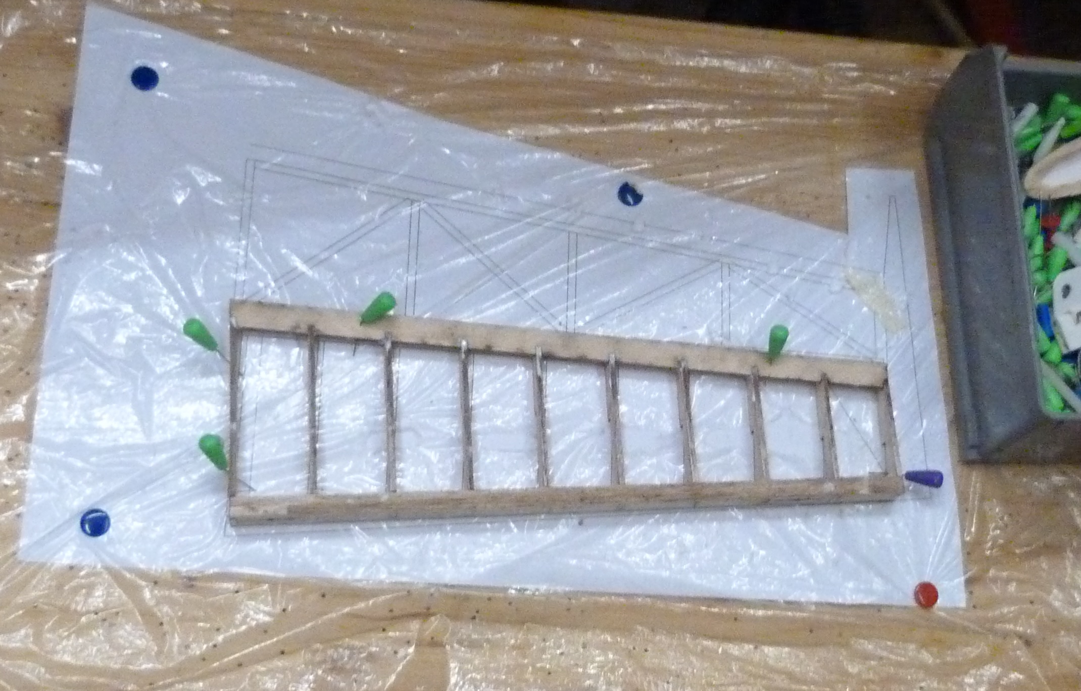 Eine Fläche ist so weit fertig und am Flugzeugrumpf habe ich einen Test mit der Beschichtung mit Folie versucht.