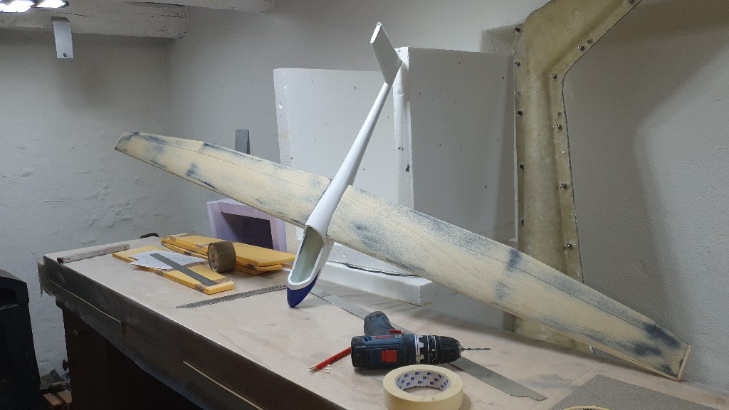 Mittlerweile sind die Tragflächen verschliffen und die Steckungs-/Torsionsbolzenlöcher sind im Rumpf. Das Haubenrahmenpositiv hat auch schon seine endgültige Form angenommen und ist quasi Abformbereit.