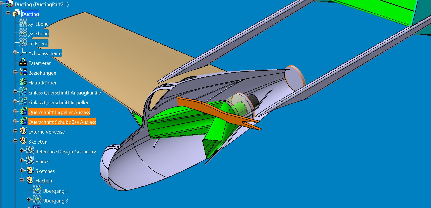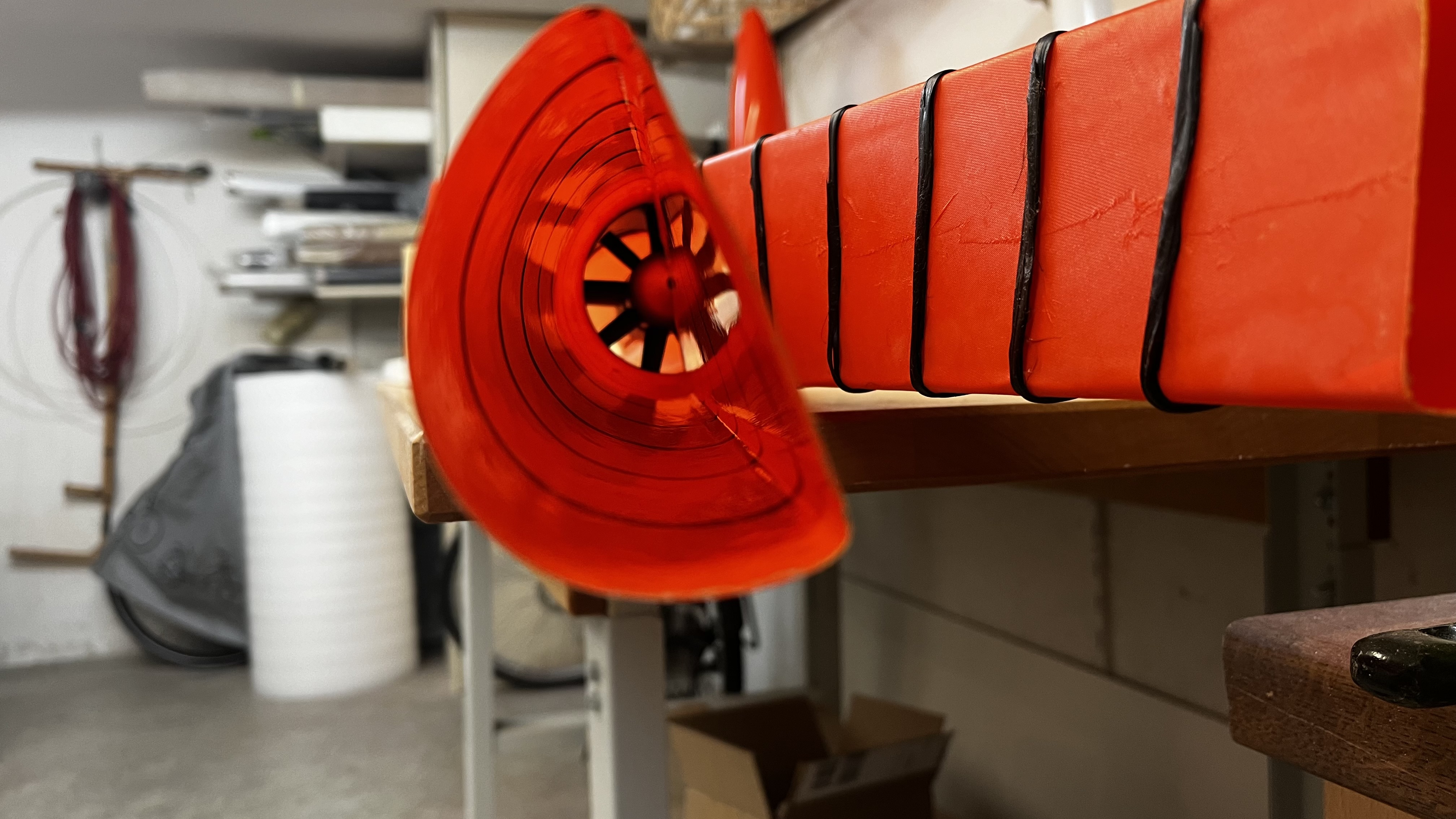 Im Gegensatz zu damals kommt heute beim 2. Flieger der 2.Strömungskörper zum Einsatz, er haengt unter der Flaeche und der Impeller von Wemo hat 70mm aber 1kg Schub, das wird spannend.