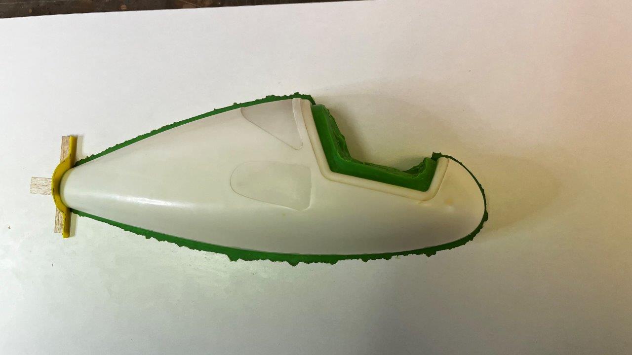 Der Rumpf wurde aus 7 Lagen 23gr Glas diagonal laminiert und wiegt mit Kabinenrahmen, fertigen Scheiben und 4 Magneten 36gr, ein vielversprechendes Gewicht.