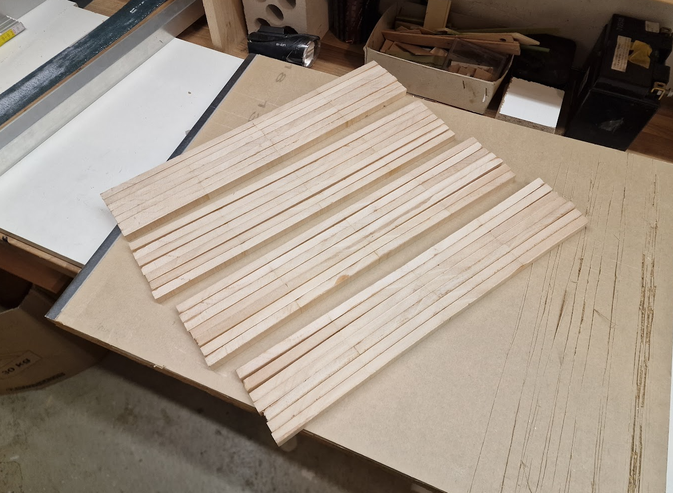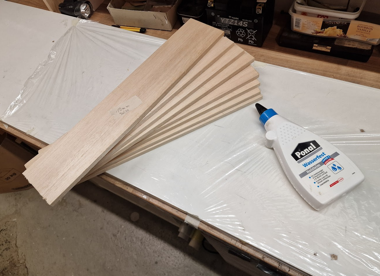 Die ersten 3 Trapeze, auf dem Kopf liegend... Auf dem Bild erkennt man den Knick kaum. Die nächsten beiden sind annähernd waagerecht und dann geht's mit den stärkeren Knicken am Aussenflügel los. Der letzte ist dann stark angewinkelt mit ordentlich Pfeilung, das wird noch spannend zu schneiden, da komme ich aber dann erst morgen dazu...