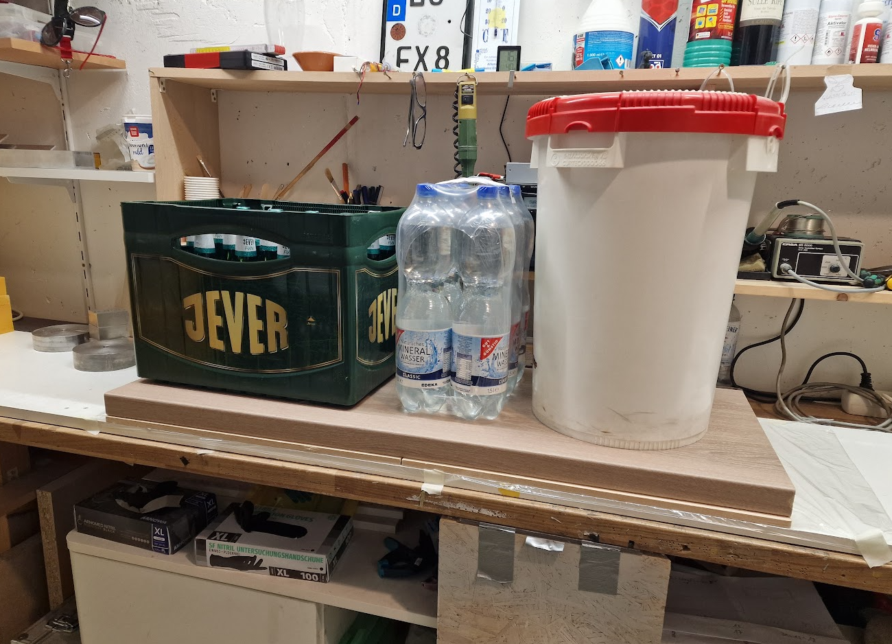 Die erste Fläche ist im Vakuum, besser gesagt, im Doppelvakuum. 2 Thomas-Pumpen kümmern sich um -0,9 Bar im 3,5m langen Sack. Die Temperbox ist provisorisch verlängert und bei gemütlichen 40°C darf die Fläche jetzt bis morgen Abend saunieren.