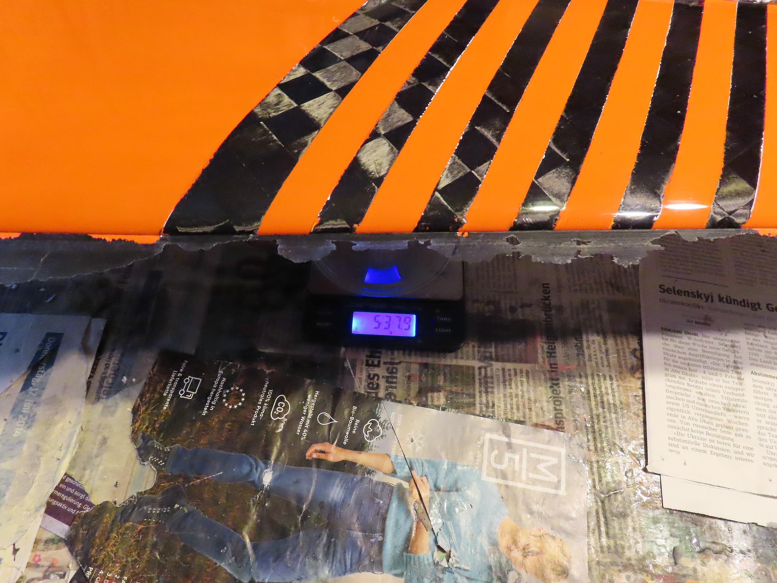 Die Schale ist ohne Stützstoff und ohne Vacuum aus 40 g/m² Carboweave, 130 g/m² Basalt und 100 g/m² ST-Kohle aufgebaut.