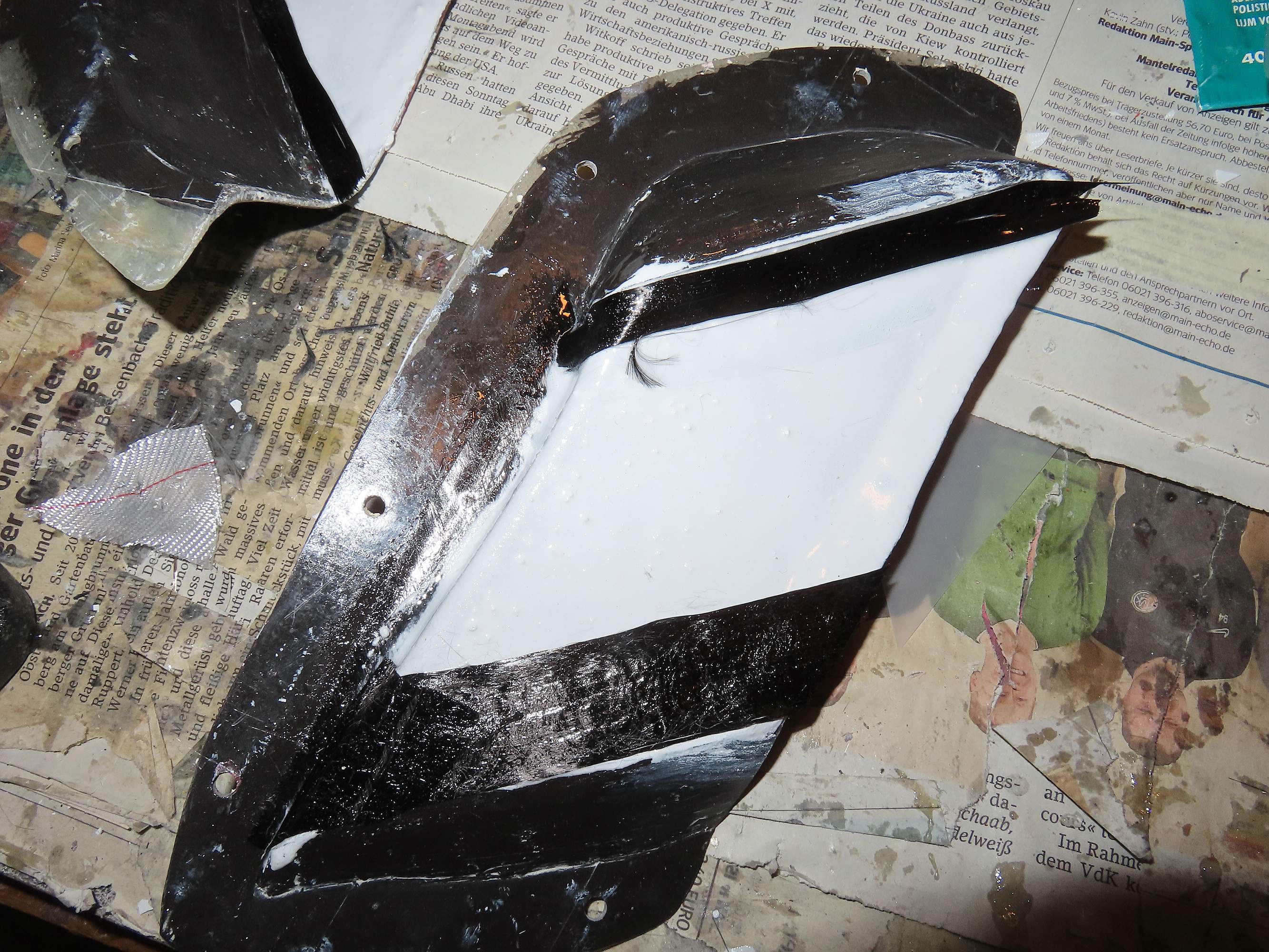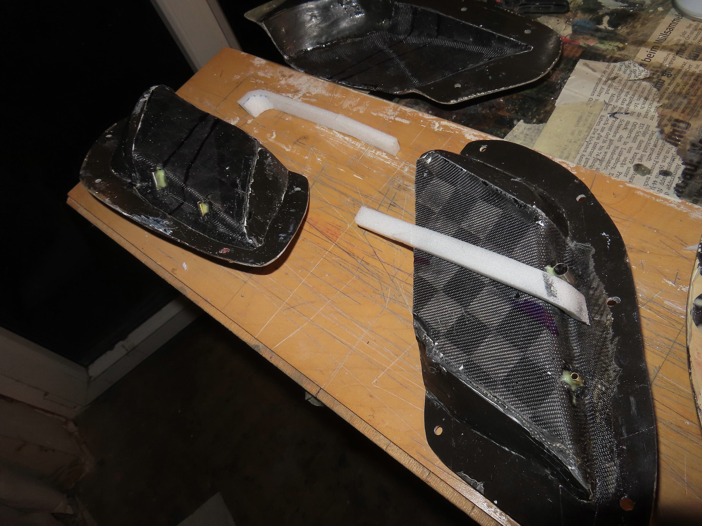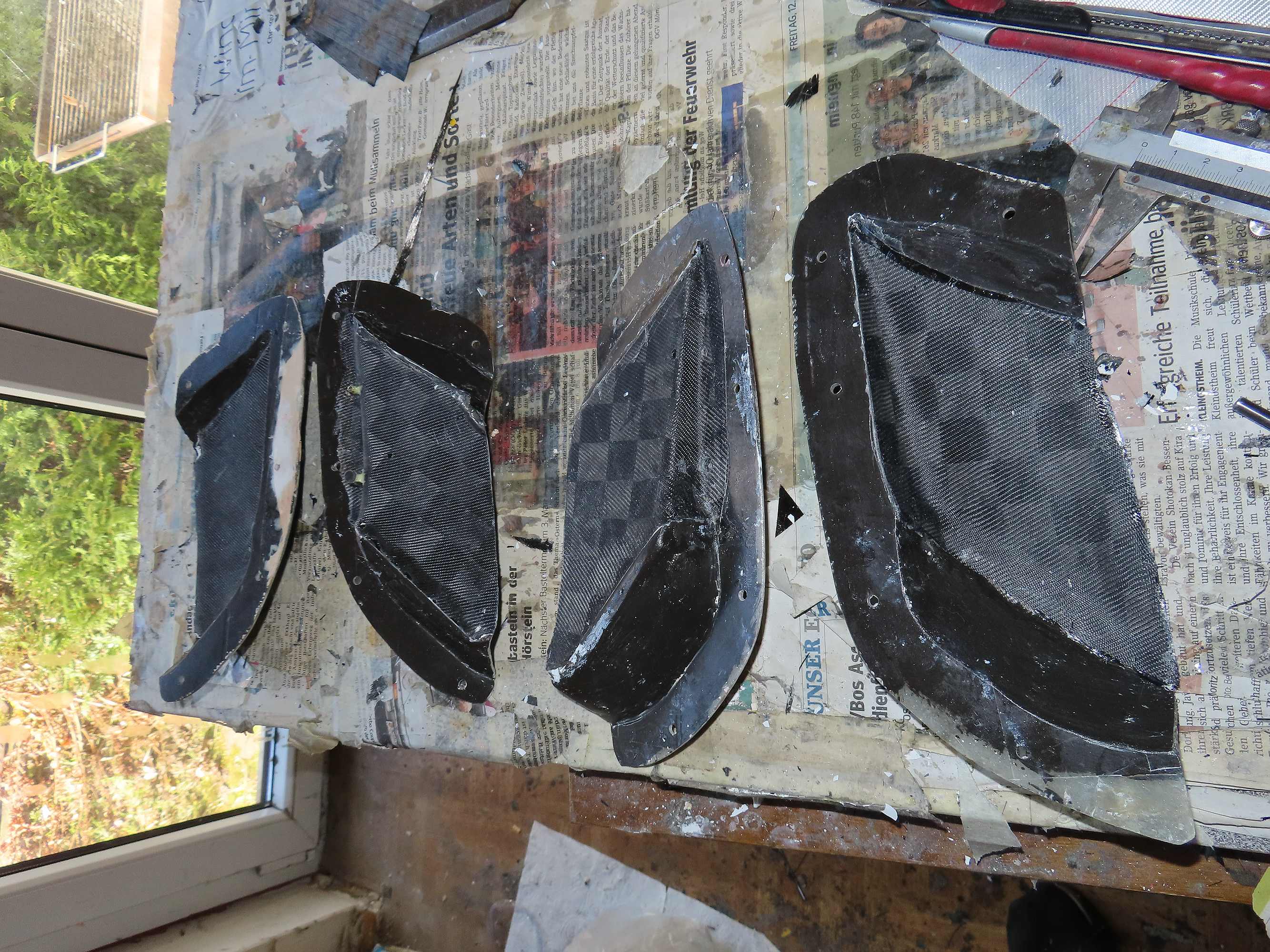 Die Formen sind wegen Protypen-Provisorium erstmal recht einfach gehalten, auch die Oberfläche ist nicht perfekt gespachtelt und feingeschliffen, dafür ist die Geometrie nicht ganz einfach. Ich habe lange rumüberlegt wie ich das stabil und trotzdem nicht zu schwer umsetzen kann.