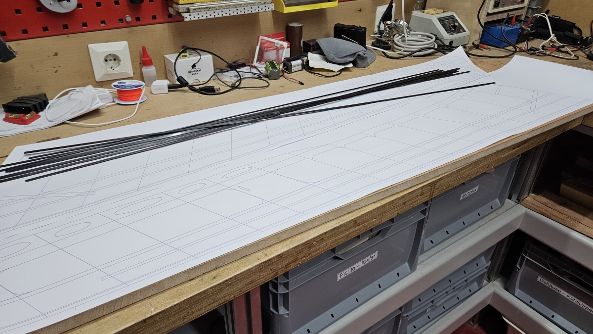 Ich habe mich entschieden, erst mal keine fancy Bauhelling zu machen, sondern bau ganz klassisch auf dem Plan. Da ich mir den immer wieder ausplotten kann, gebe ich mir keine Mühe, den mit Folie abzudecken.