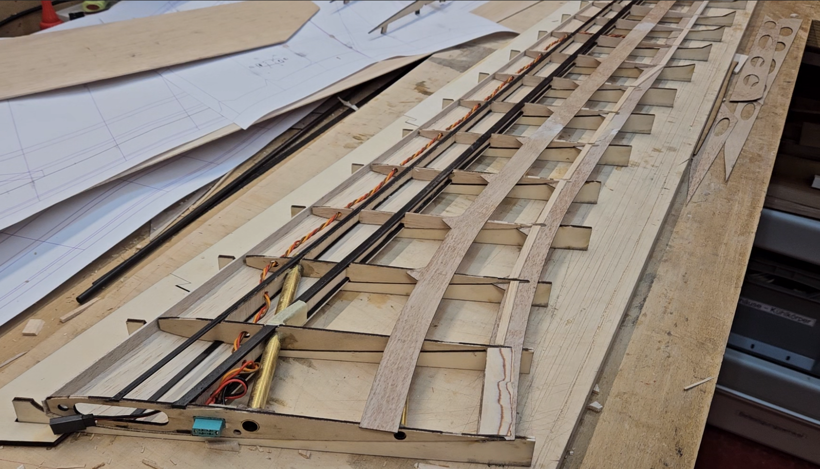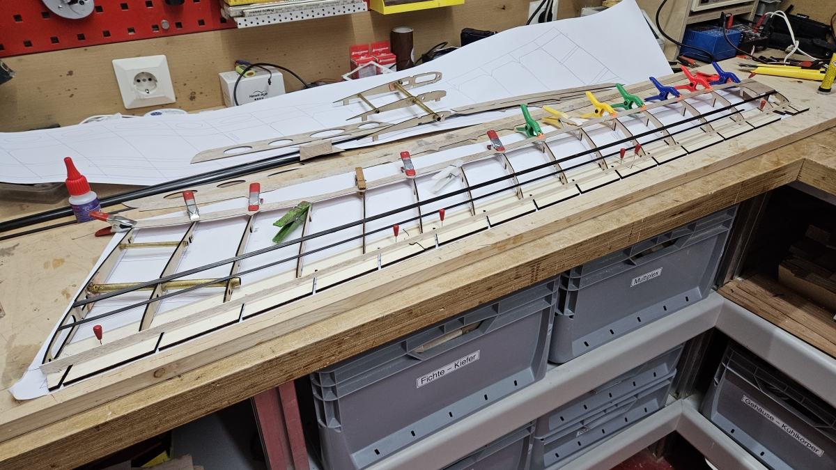 Damit das mit den Verwindungswinkeln sauber passt, habe eine Helling gemacht, in der der Flügel mit der Oberseite gelegt wird, um die Unterseite zu beplanken. Dazu habe ich die Bauschablone für die Rippen nochmal verwendet.