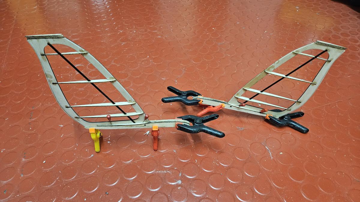 • Die Flächen wiegen jetzt 190g das Stück - leichter kann ich nicht bauen. Habe schon überwiegend Sekundenkleber verwendet und nur Balsa und Kohle. Wenn das jemand noch leichter hinkriegt, ohne, dass es fragil wird - Hut ab.