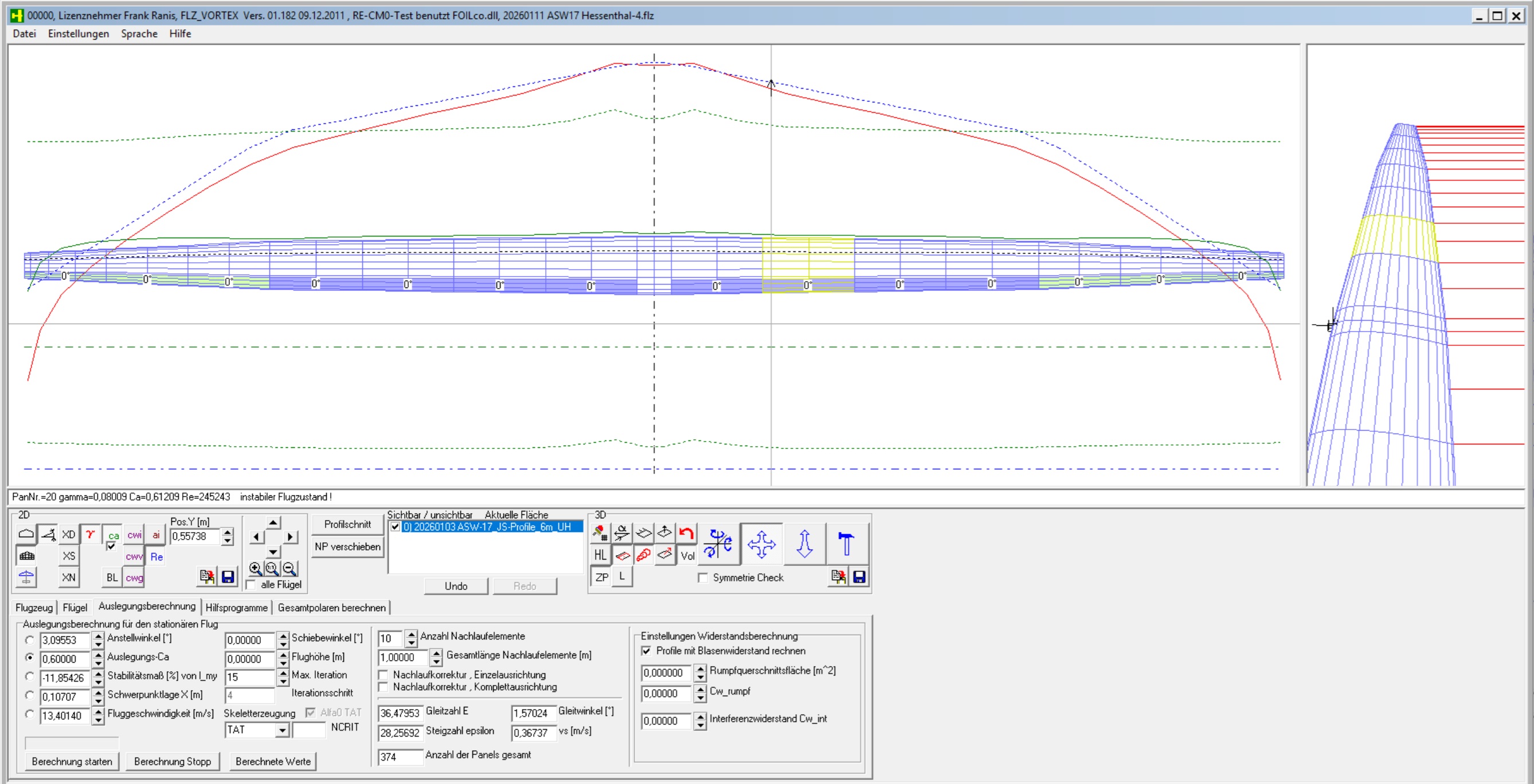 Hier jetzt noch die Screenshots der fertigen Version der Auslegung aus dem FLZ_Vortex und ein Screenshot mit den Profilen.