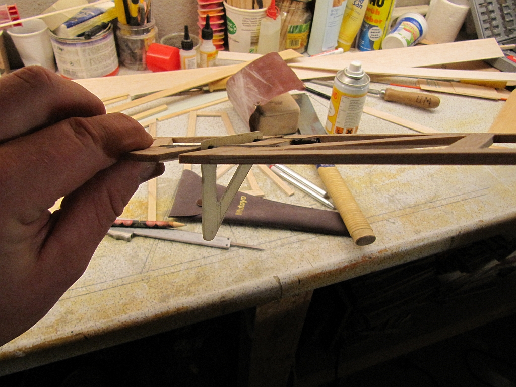 Der Rumpf wird aus 1mm, 2mm und 3mm Balsa mit zwei Sperrholzspanten zur Flächenaufnahme und in den Ecken 4x4 mm Kiefernleistchen gebaut werden, die Leitwerke wohl doch ein Gerüst aus 4mm Balsa, nicht wie geplant als Balsasandwich mit Aussparungen. Die Flächen werden aus 1,5mm Balsarippen, mitig davon 2 gedoppelten und 3 Sperrholzrippen gebaut. Holme werden 2st 5x10 Kiefernleisten im Mittelteil und an den Ohren 2st 3x7 mit stehenden Balsaplättchen dazwischen. Nasenleiste im Mittelteil 6x6 und an den Ohren 4x4 Kiefer. Beplankung und Endleiste beidseitig 1mm Balsa. Die Fläche wird einteilig, vorne mit Dübel und hinten geschraubt am Rumpf fixiert. Die Verbinderwinkel werden aus Sperrholz gesägt.