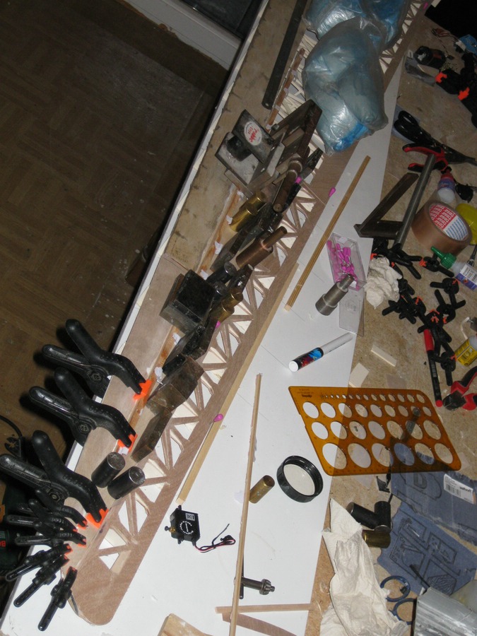Alle Modelle entstehen aus gefrästen Pappel- und Birkensperrholzrippen und sind mit 0,6 mm Birkensperrholz beplankt (außer bei Brian, ich glaub der beplankt mit 0,4 mm Birke). Die Holme bestehen bei allen aus Kieferleisten, nur ich verwende laminierte Kohleholme. Die bisher fliegenden 3 Modelle haben schon bei relativ niedrigen Geschwindigkeiten Probleme mit Flügelflattern die ich von meiner ähnlich großen Ho IIIe nicht kenne, deshalb bau ich einige Modifikationen ein um das hoffentlich bei mir abzustellen...die Ur-Konstruktion ist nicht von mir.