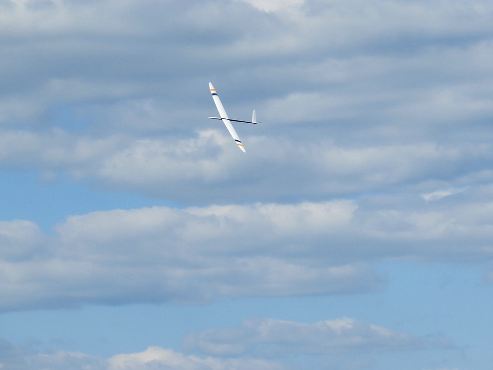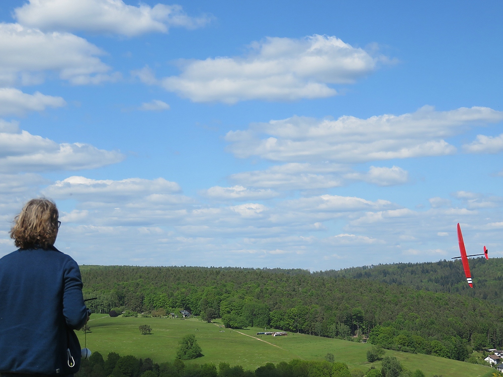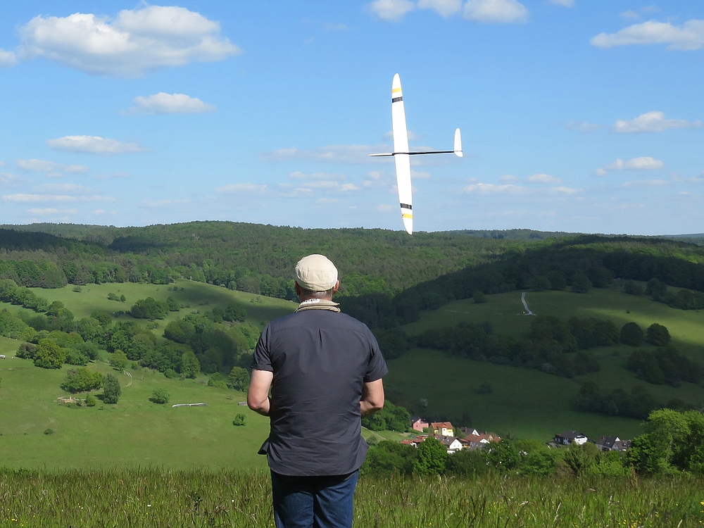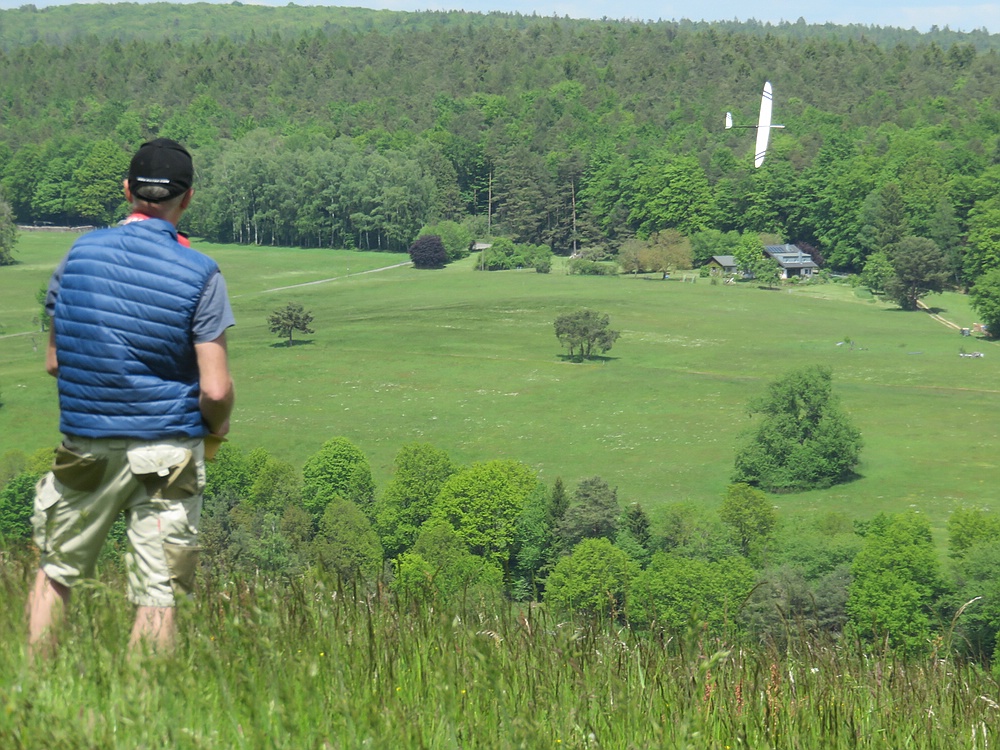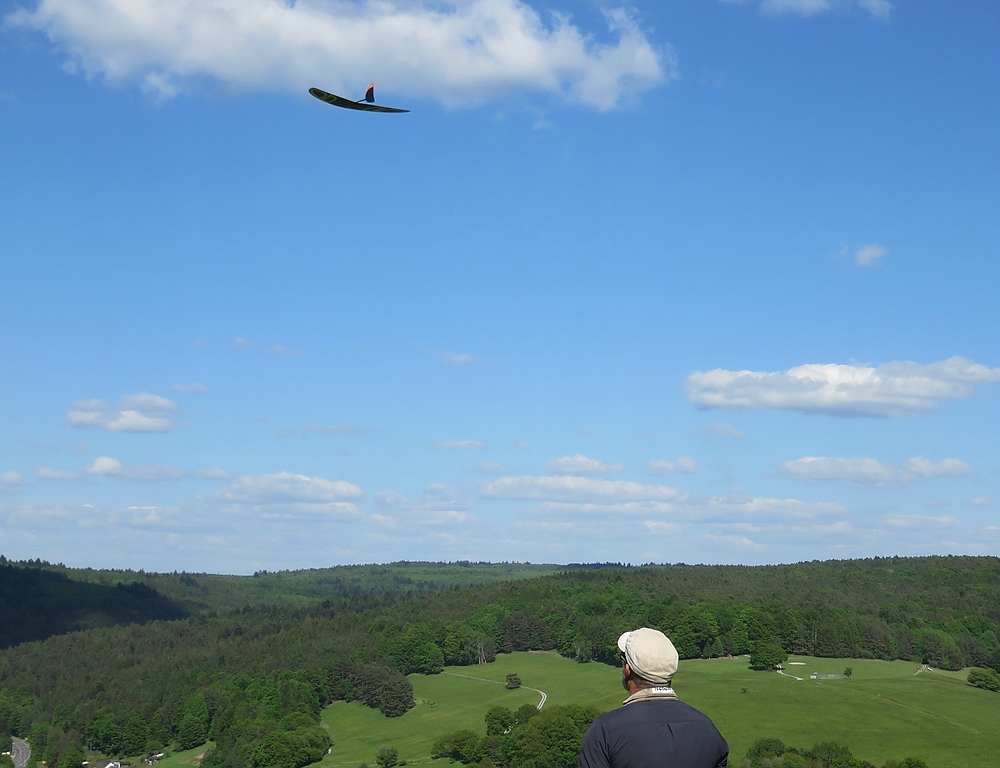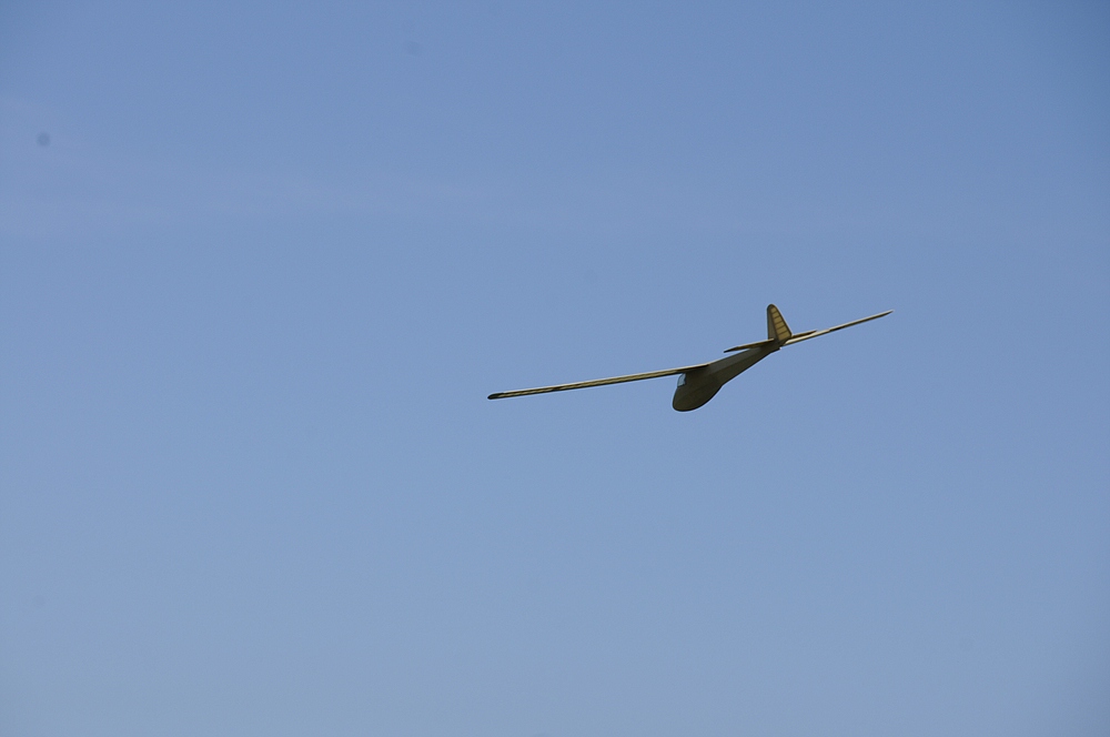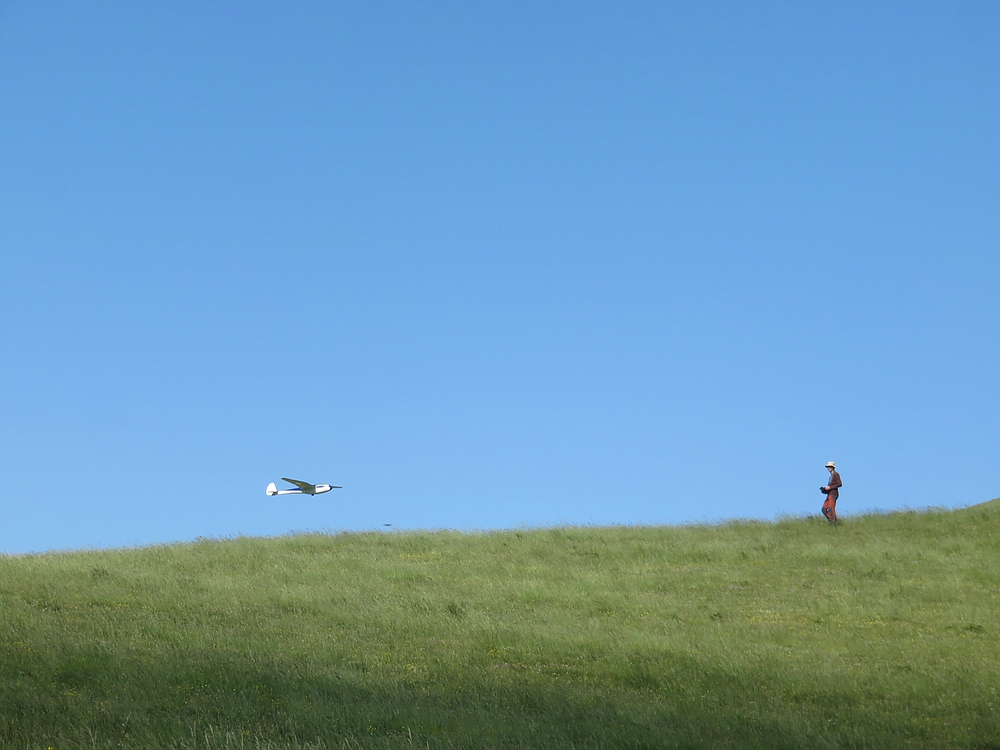 Am frühen Nachmittag mit weniger Wind und mehr Thermik machte die Luft die Flieger recht schnell, sogar die kleine 1,25 m Horten IX machte als PSS mehr Spaß als mit Impeller und durfte auch ein paar flotte DS-Runden drehen.