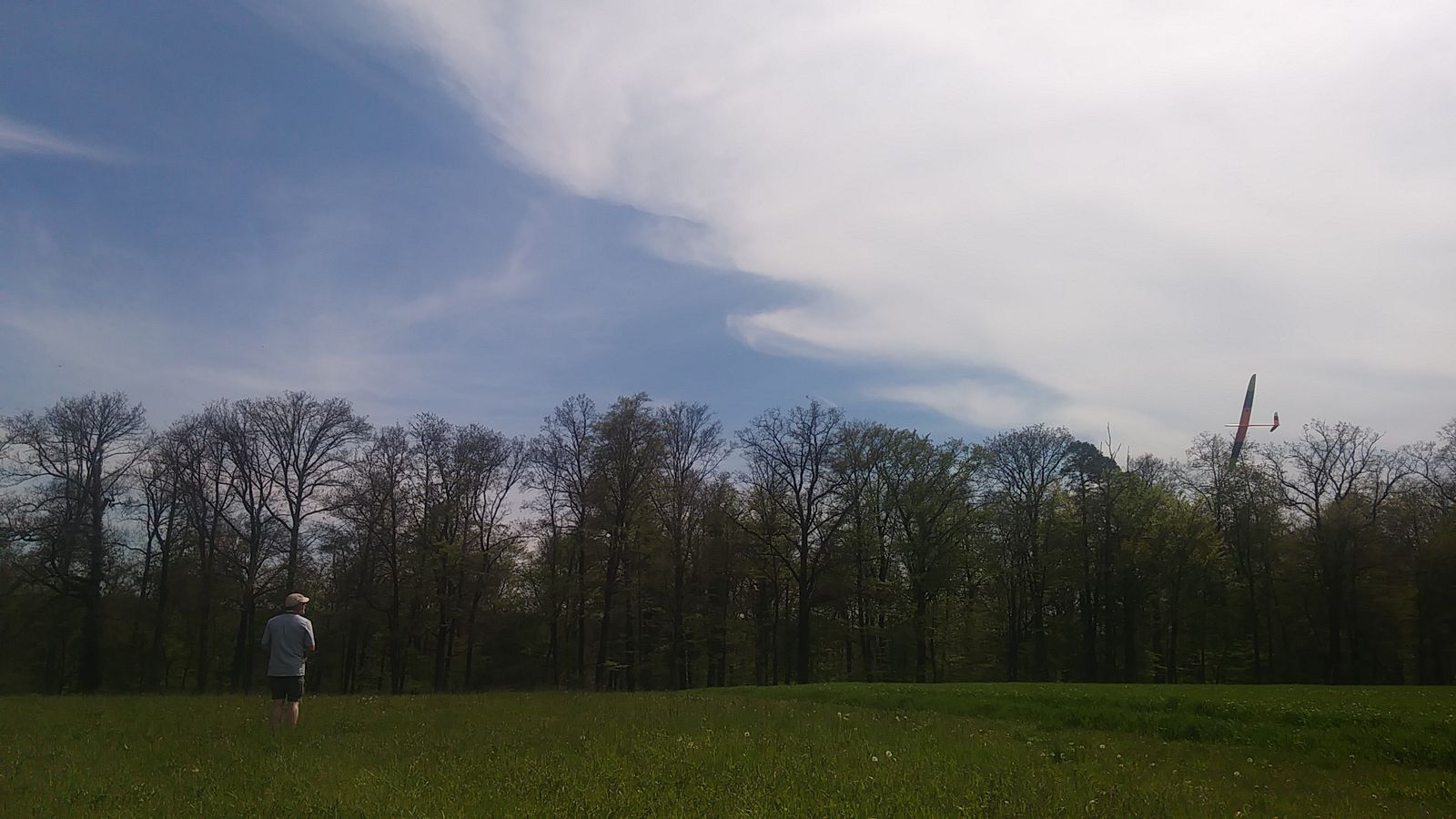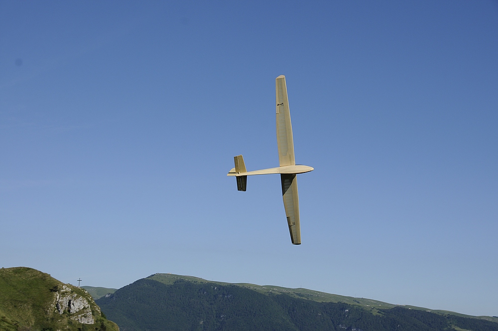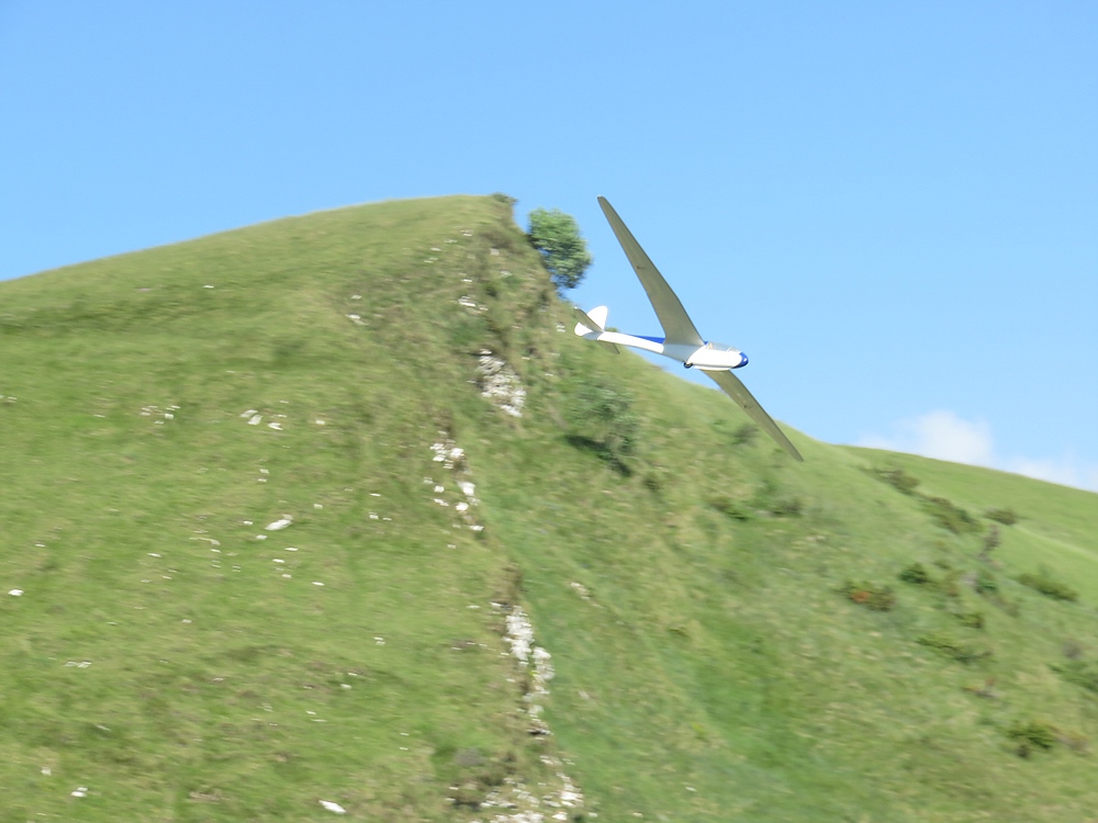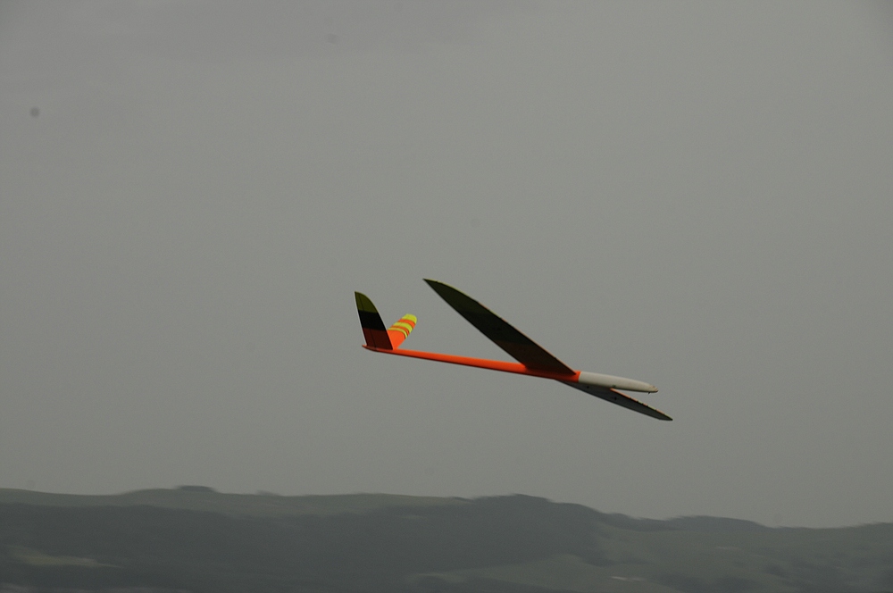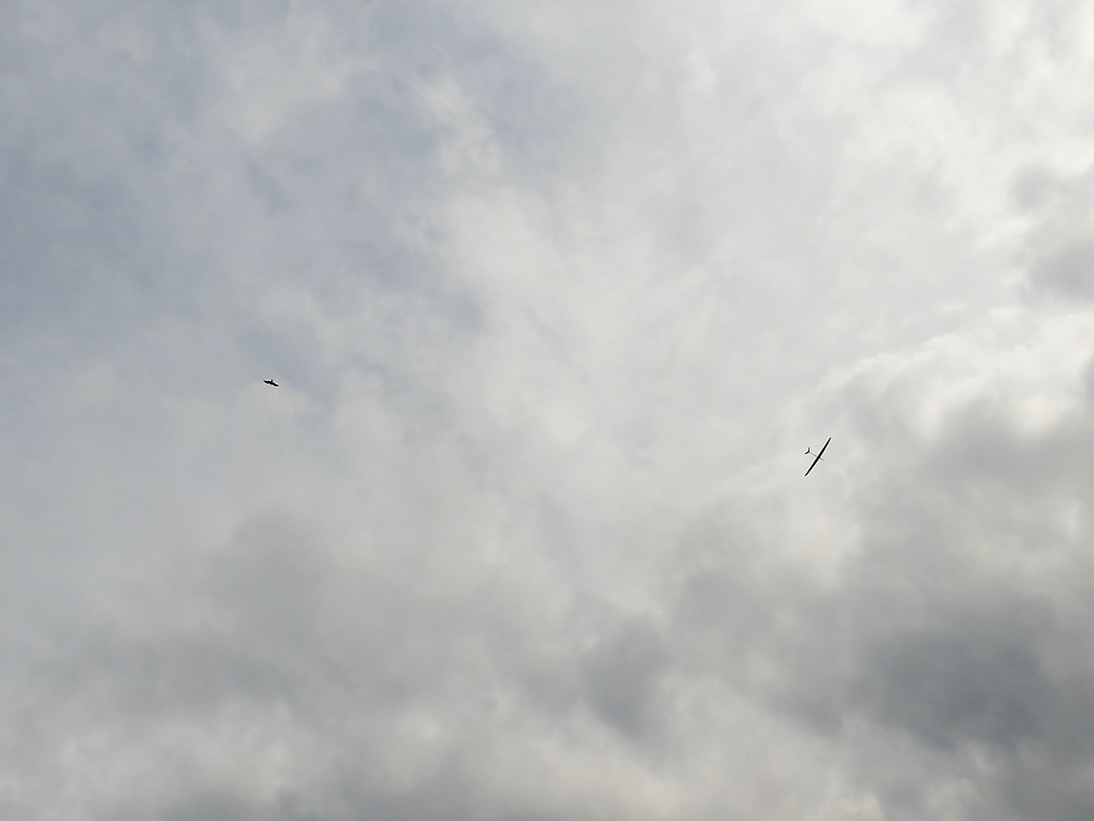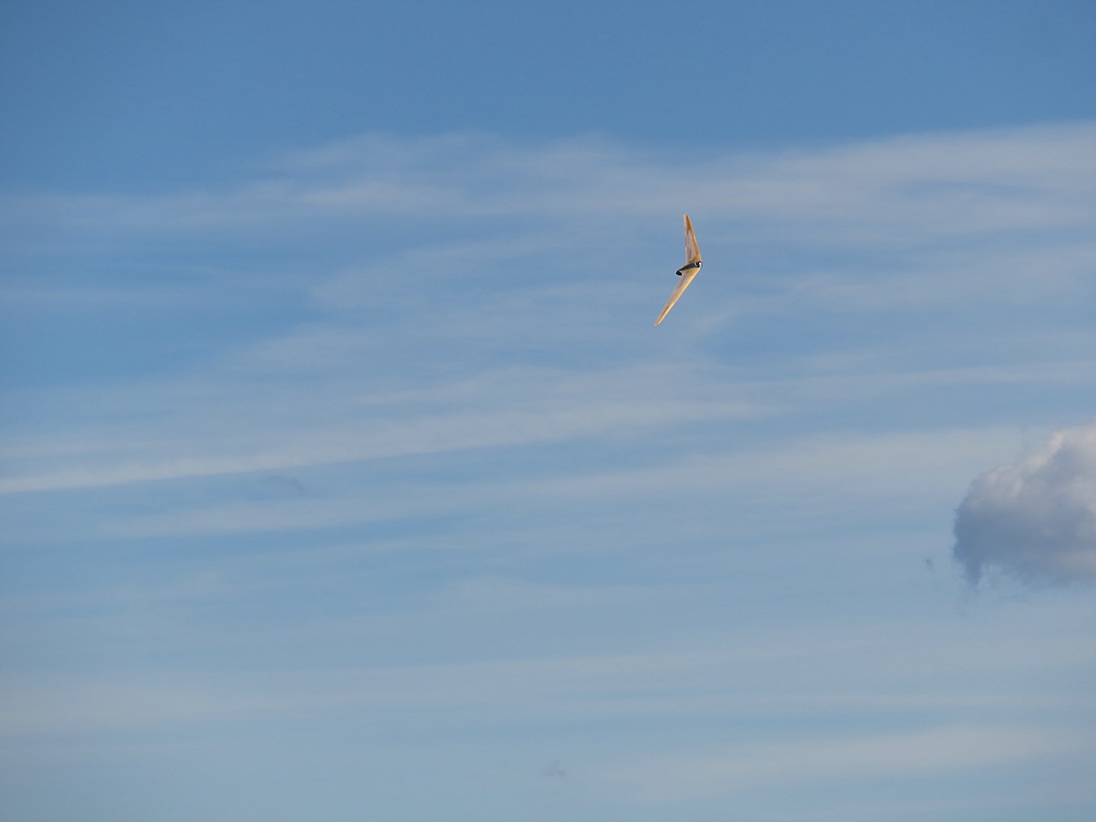 Am frühen Nachmittag mit weniger Wind und mehr Thermik machte die Luft die Flieger recht schnell, sogar die kleine 1,25 m Horten IX machte als PSS mehr Spaß als mit Impeller und durfte auch ein paar flotte DS-Runden drehen.