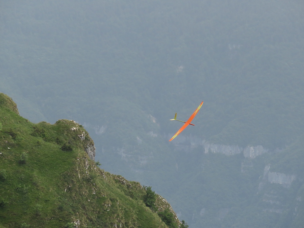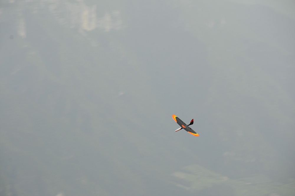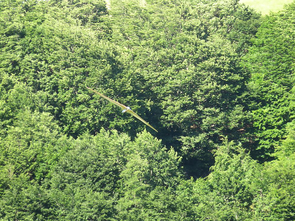 Am Ende durfte der 76 cm Lilloo sogar noch einige DS-Runden mit geschätzt 70-80 km/h in der Windscherung zwischen Abendthermik und dem Lee über der Landewiese drehen...bei ein paar Runden zusammen mit einigen Schwalben die aus der Windscherung ebenfalls Flugenergie gezogen haben.