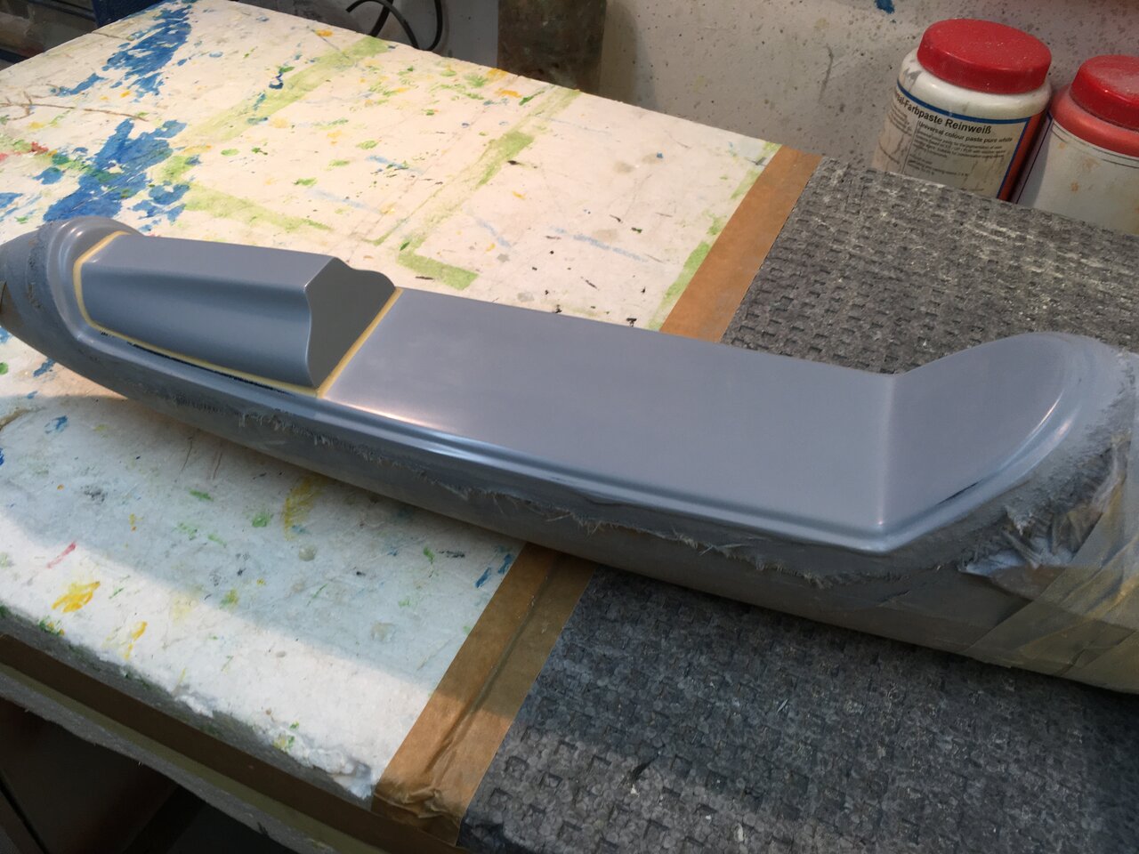 Nach ein paar irren Wochen des völligen Wahnsinns im Geschäft, hat sich in einem Regenfenster, nach erfolgreicher Eiersuche, heute die Gelegenheit ergeben, den Rumpf endlich zu lackieren. 8-)