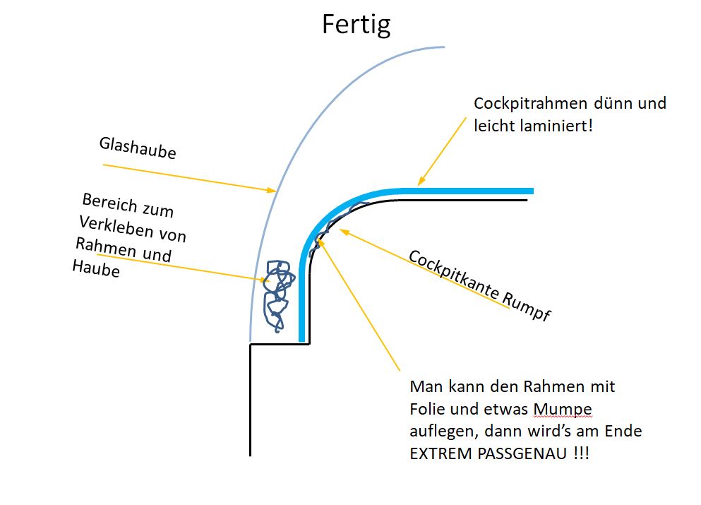 Wenn man dann den Rahmen in dieser Form laminiert, hat man etwa 1mm Luft für das Glas über bei grob 3 Lagen 163er Köper, also den perfekten Abstand um die Haube aufzukleben. Vorher drückt man den fertigen Rahmen in ein, auf die Sicke auf dem Rumpf per "Zuckerbäcker-Spritztüte" gedrücktes Mumpebett. So hat man einen 110% saugend passenden Haubenrahmen mit möglichst wenig Nacharbeit.