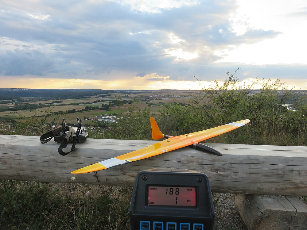 Ich hatte Miniray, Toy und die DSL Needle100 V dabei. Als in einem Regenschauer keiner fliegen wollte hab ich mit dem Miniray schon mal vorgetestet, aber Regen bremst. Nach einem gaaanz schnellen Flug von Robert und Jörgs PB-Flug durfte mein Toy DS ran und hat nach weniger als 2 Minuten 304 km/h geschafft, mein bisher schnellster Flug mit dem Modell: