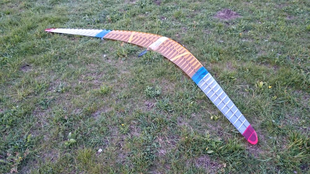 Die Rippen im Transparent / Klar bespannten bereich sind frei drehend auf dem Holm aufgefädelt nur die letzten zwei Rippen mit dem Randbogen sind mit dem Holm verklebt so ergibbt sich eine Lineare verwindung.