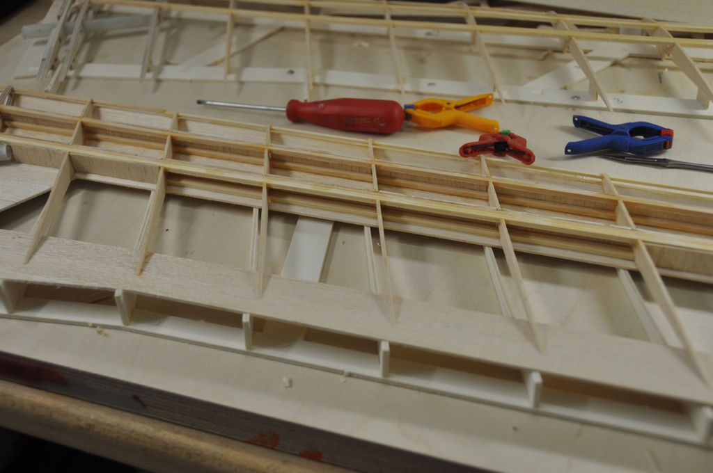 Die Endleiste ist recht dünn, die sollte mit einem oder zwei Streifen Glasgewebe ~ 50 g/dm² diagonal verstärkt werden. Früher habe ich die Endleiste auch nur mit Sekundenkleber gehärtet, das würde auch gehen, oder eine 0,4 mm Sperrholzeinlage unten. Bei der Sperrholzeinlage ist es dann aber ratsam, die untere gefräste Endleistenbeplankung aus 1,5 mm Balsa, die dem Bausatz beiliegt, durch eine 1 mm-Beplankung in Eigenregie zu ersetzen.