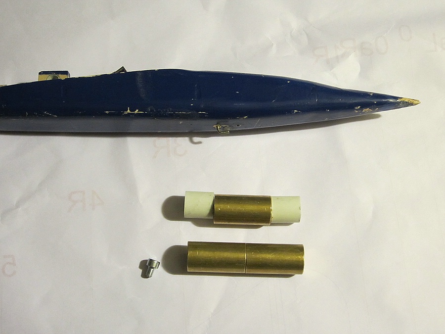 Die Maße der Ballast- Messingzylinder sind je d x l = 20 x 38 mm, 2 x 40 mm Länge geht auch noch ohne Schwerpunktverschiebung rein. Gewicht je hier je 97 Gramm.