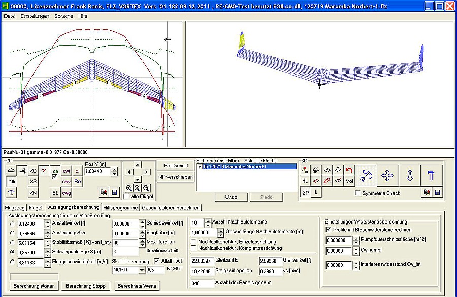 hier zeigt sich wieder ein Mal wie schwierig es ist Nurflügel zu beurteilen. Du hast Dir sicher Mühe gegeben Deinen Marumba gut zu vermessen, hast eine schöne CAD-Zeichnung davon gemacht, diese Werte habe ich genau so in das FLZ_Vortex übernommen und trotzdem ist irgendwo ein Fehler drin