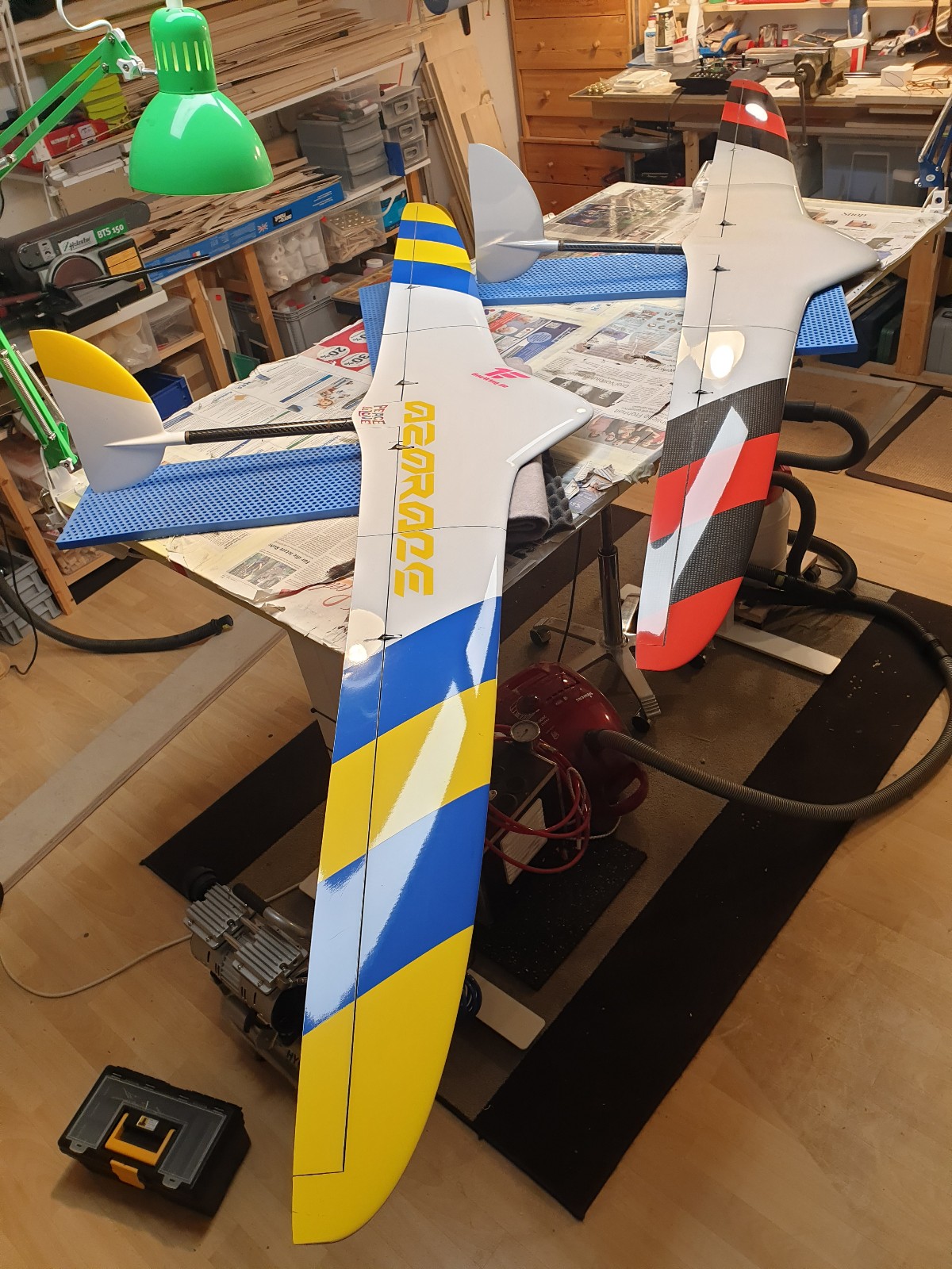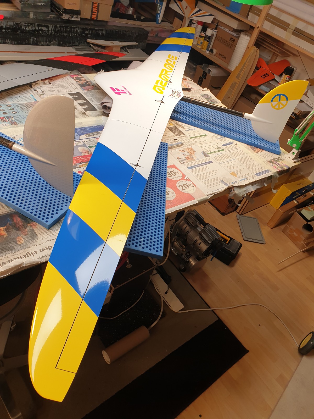eben alles bespannt, jetzt noch die Ruder anscharnieren, da möchte ich einen Tesa/Siikonmix machen.