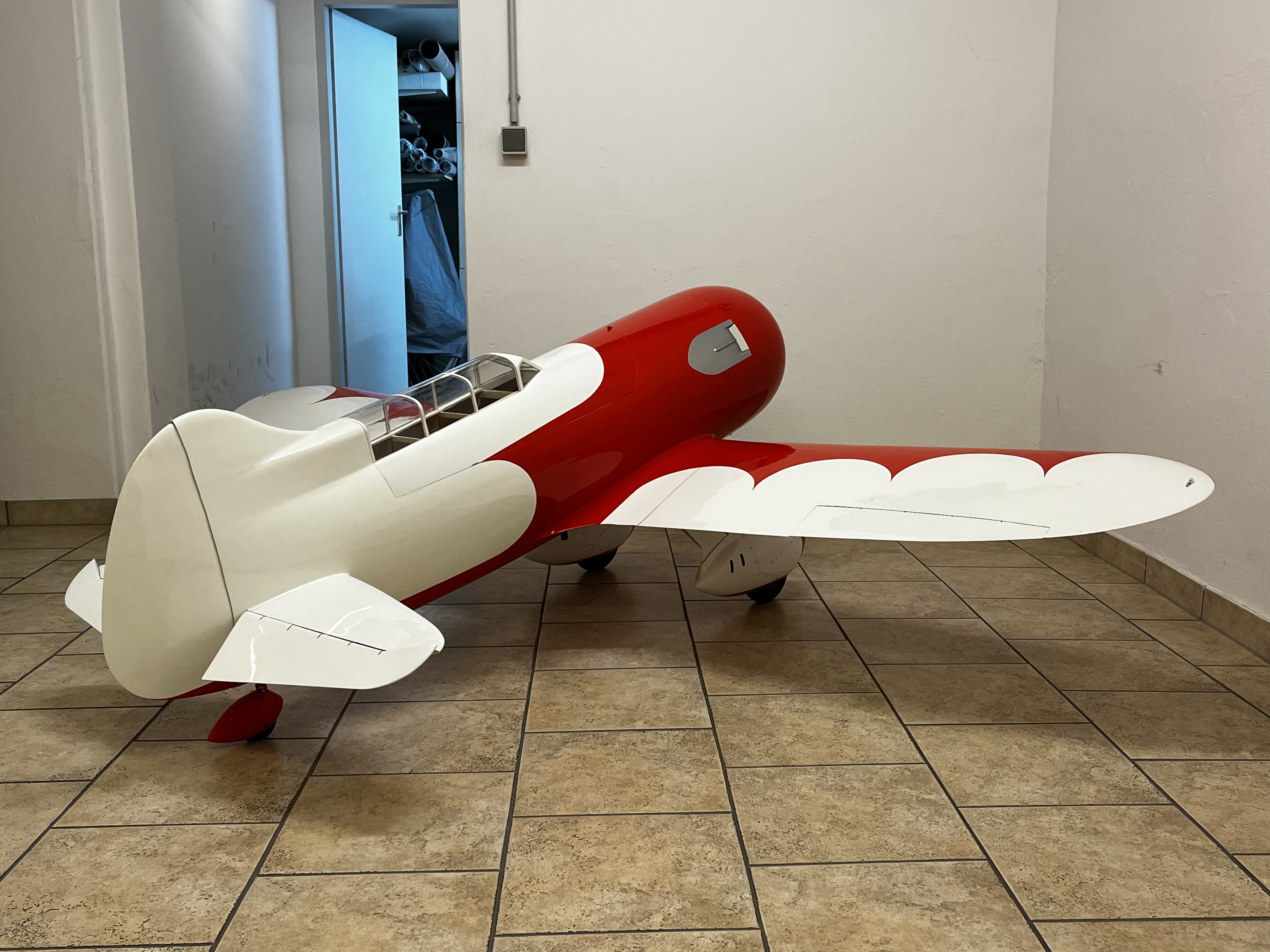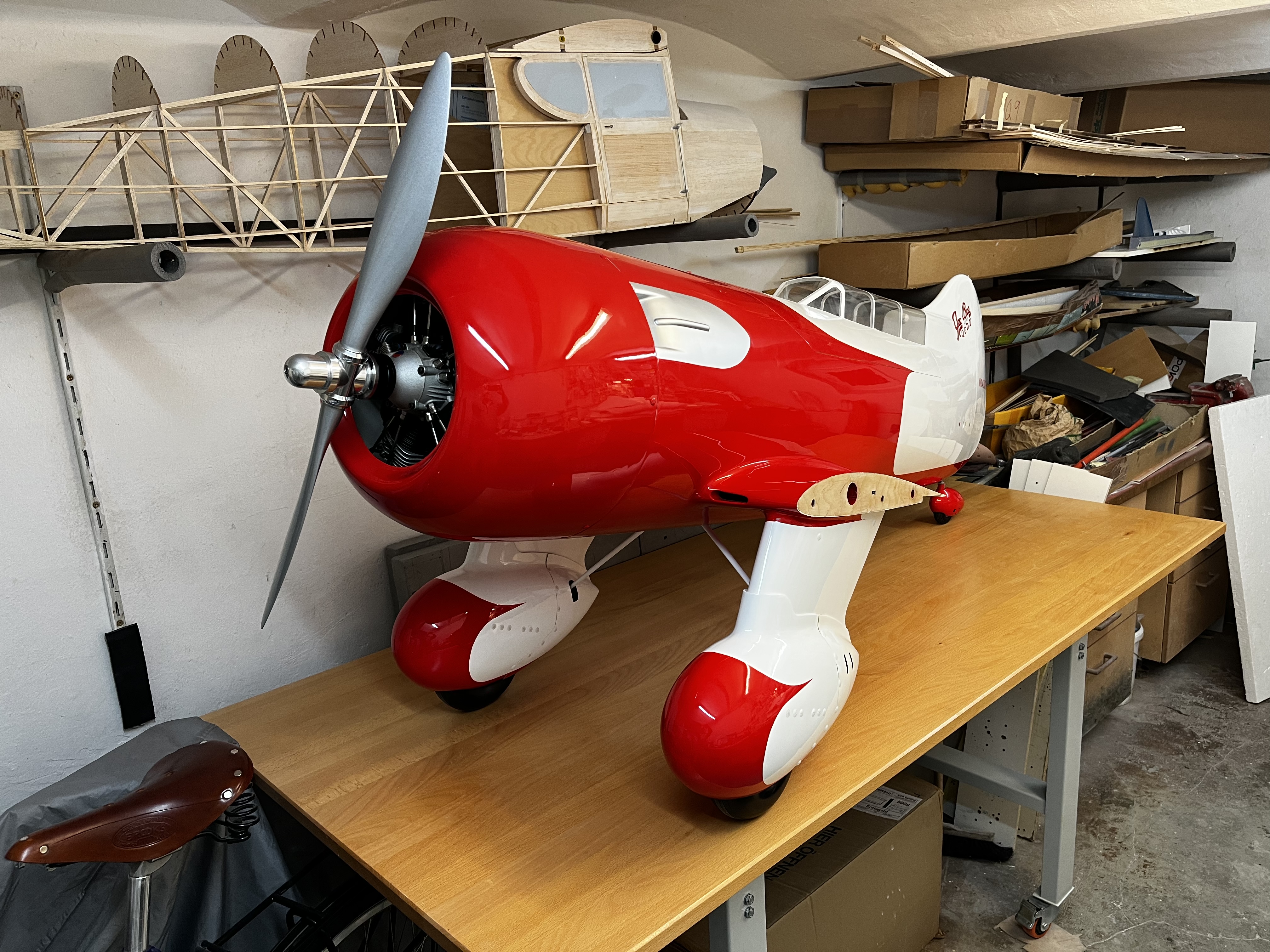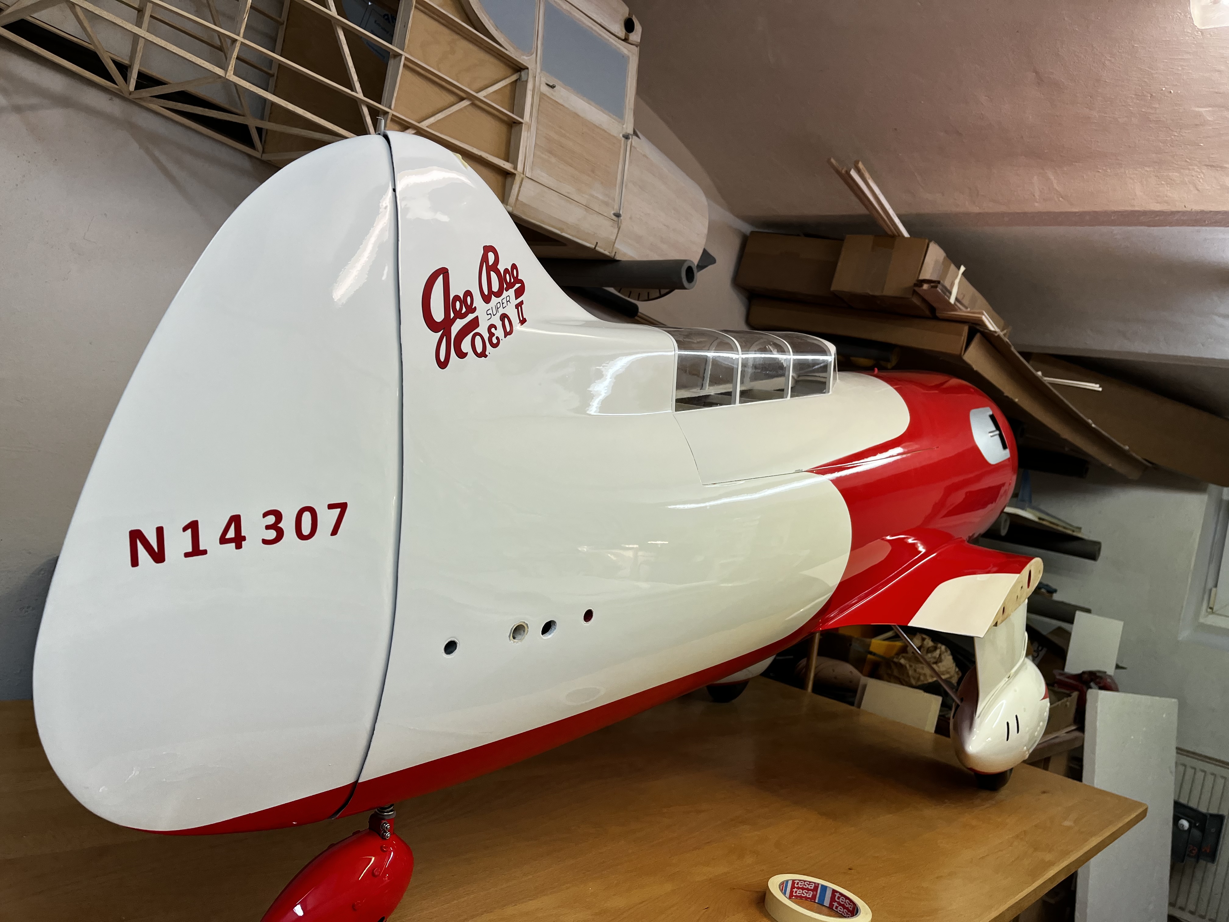 Jetzt die Bilder der GerBee R6H super QED II so wie sie Jim Moss sie gebaut hat und wie Richard Alldredge sie geflogen ist im Maßstab 1:4,4 mit genau 100inch wingspan und derzeit 150er Moki Bauraum reicht f den 250/5 auch aus 🤣 :