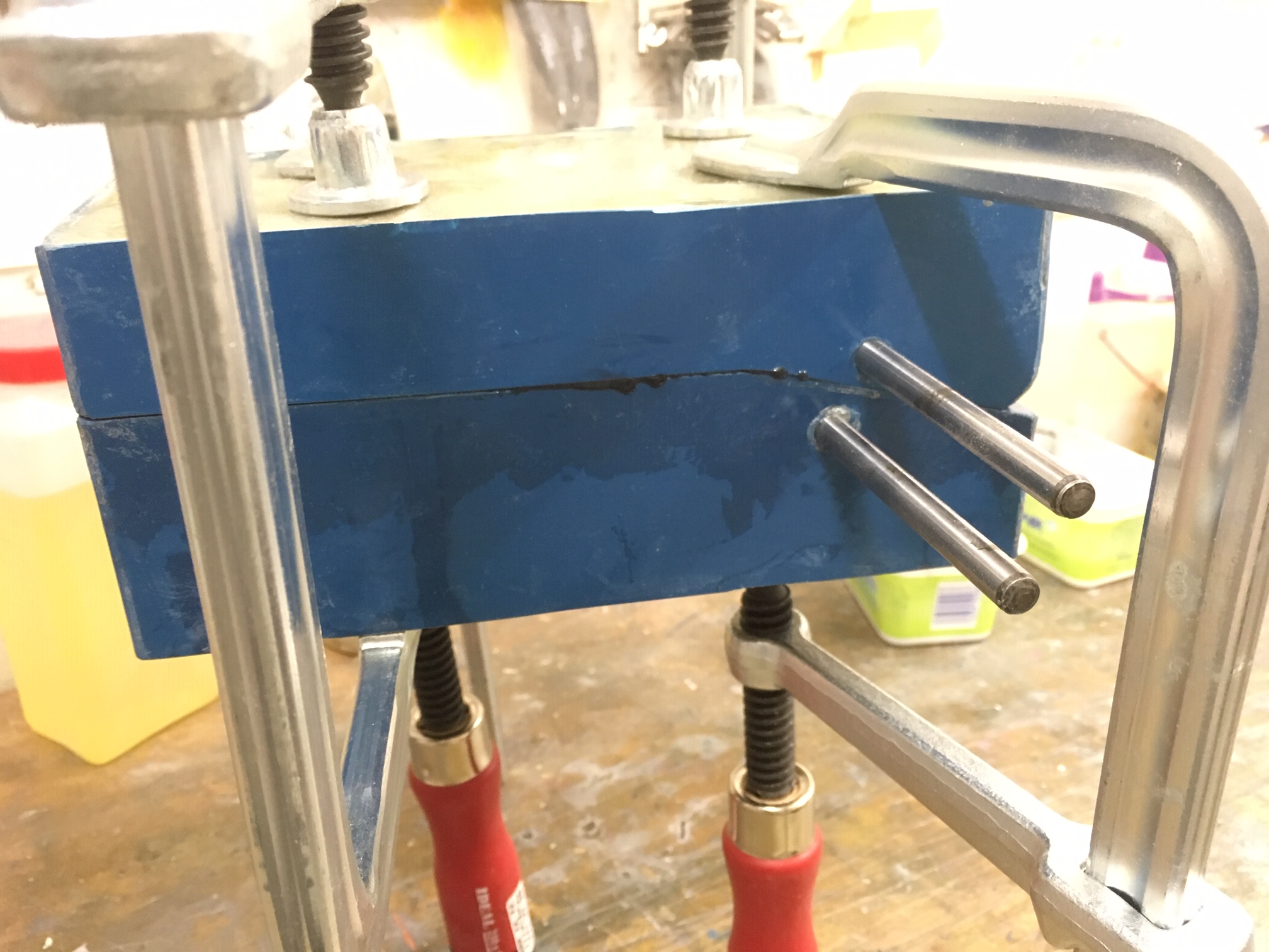 Eigentlich ganz einfach - auf der Oberseite einen Streifen Tesa, in diesem Fall weisses, aufkleben. Dann von unten dünn das Wacker Elastosil einspritzen.