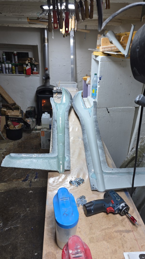 Es wiegt 150gr aber man kann die Herstellung bestimmt noch perfektionieren ich habe aber sowas bon keinen bock dass ich froh bin wenn das 2. bein genauso laminiert ist und ich 2 nutzbare Bauteile habe.