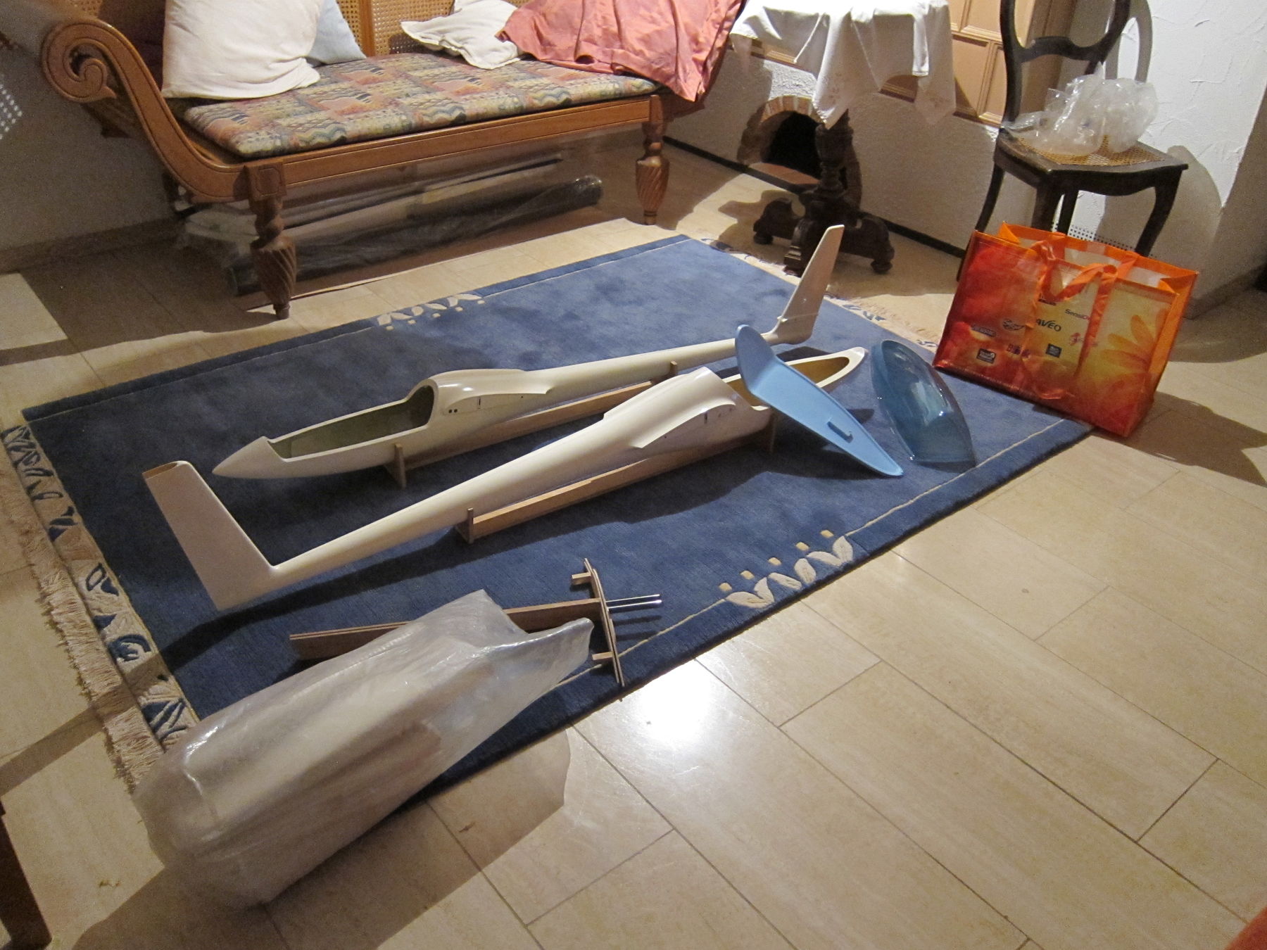 gekauft ist malwieder das falsche Wort, aber bevor ich meine erste DLG-Flächenhälfte einlegen durfte, bekam ich von einem ortsansässigen Modellbauer noch eine sehr nette „Lern mehr bauen!”-Spende! Zusammen im Set mit einem Haubenrahmen, zwei Hauben die ich nochnicht kapiert habe wie sie jemals auf eines der Modelle passen soll, 2 Säcken voller halb- bis ganz fertigen Leitwerke, sowie einem angefangenen Steckungs- und Wurzelstück.