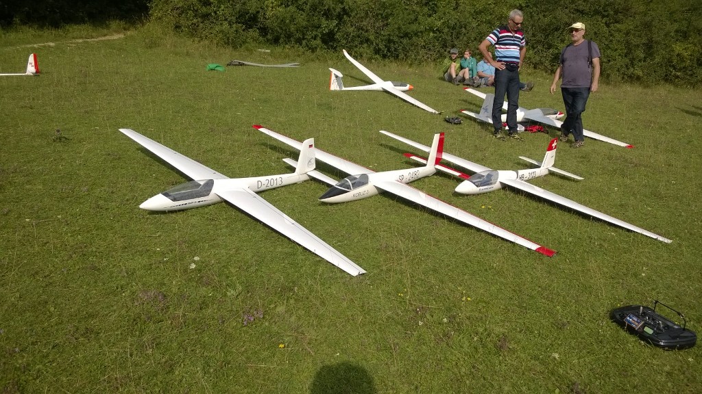 Wind hatten wir, teils von hinten, aber das hat an dem Hügelchen nicht weiter gestört. Es ging, wenn man mal die ersten 100m per Quirl geschafft hatte, in Rekordzeit per Thermik auf Sichthöhe und kaum noch runter. Dank schlechter Sicht, es war bissl diesig, war das aber nicht sooo irre hoch. Tilman hatte bissl Pech mit seinem Regler, aber Dario und ich sind fast durchgängig geflogen mit Phoenix, Blechnik und ASH-26. Sogar der alte krumme Kreistwienix durfte bissl auf Gleitflug gehen ;-)