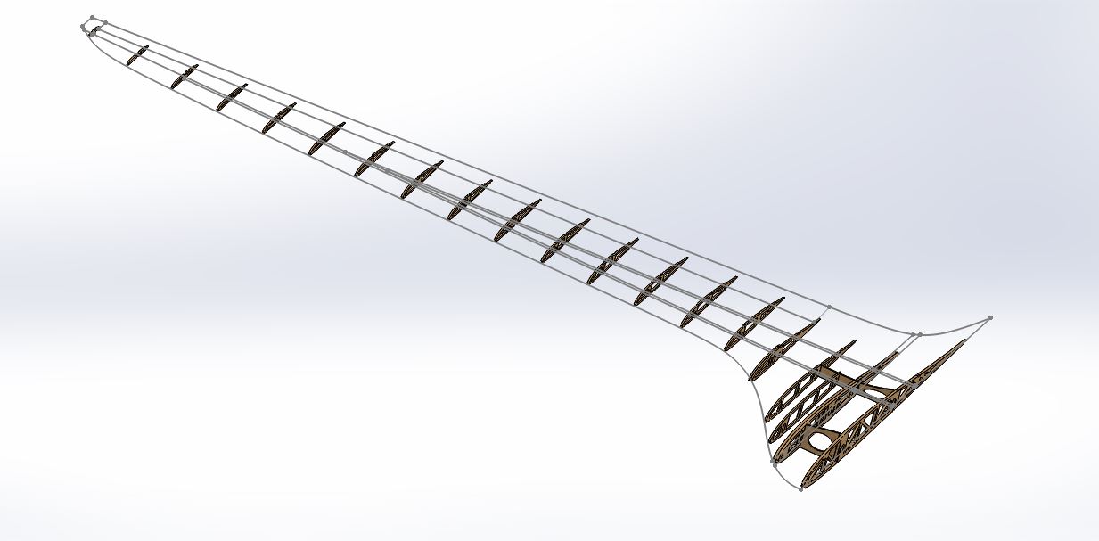 Zu Norberts Rippen: Fachwerkrippen haben normalerweise Diagonalen um die Spannungspitzen an den Knoten zu reduzieren, sonst brechen die Rippen an den Ecken der Löcher, besonders bei so einem rumpflosen Flügel der auf dem Bauch und damit auf den Rippen landen muss.