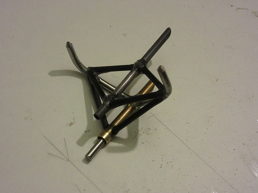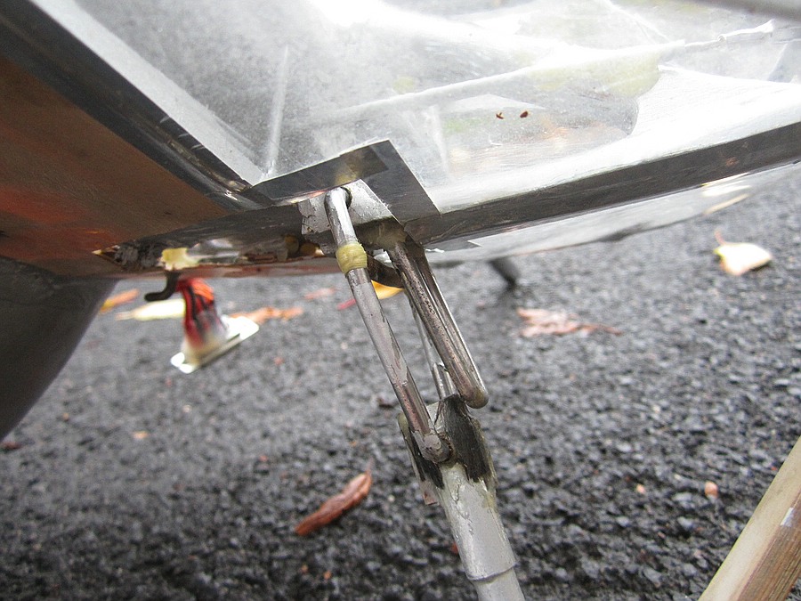 Zunächst das Steuerhorn im Rohbau und ein Bild vom selben Teil an der Oberschleißheimer Horten IVa, ebenfalls im (eingebauten) Rohbauzustand. Entgegen erster Überlegungen habe ich es nicht komplett aus gelötetem Messingrohr gebaut, sondern aus Edelstahldraht, Messingrohr und Kohlerohr in CA-geklebter Gemischtbauweise.