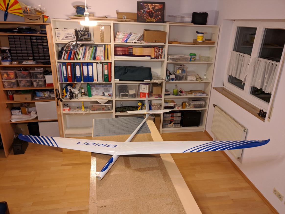 Ein schöner alltagsflieger für das liebste Hügelchen hier um die Ecke. Jetzt muss nurnoch ein Ausbau gefunden werden, der standesgemäß ist, und die Kiste nicht zu schwer macht. Viele bauen anscheinend 2200er 3S, große 200g-Motore und so ein … das ist mir in einem Segler eigentlich zuwieder. Ich will ’ne Absaufhilfe, und mal auf 100m kommen können wenn von unten raus so gar nix kommen mag (… nachdem man sich versucht hat natürlich) — mehr nicht. Da braucht’s keine Raketentriebwerke.l