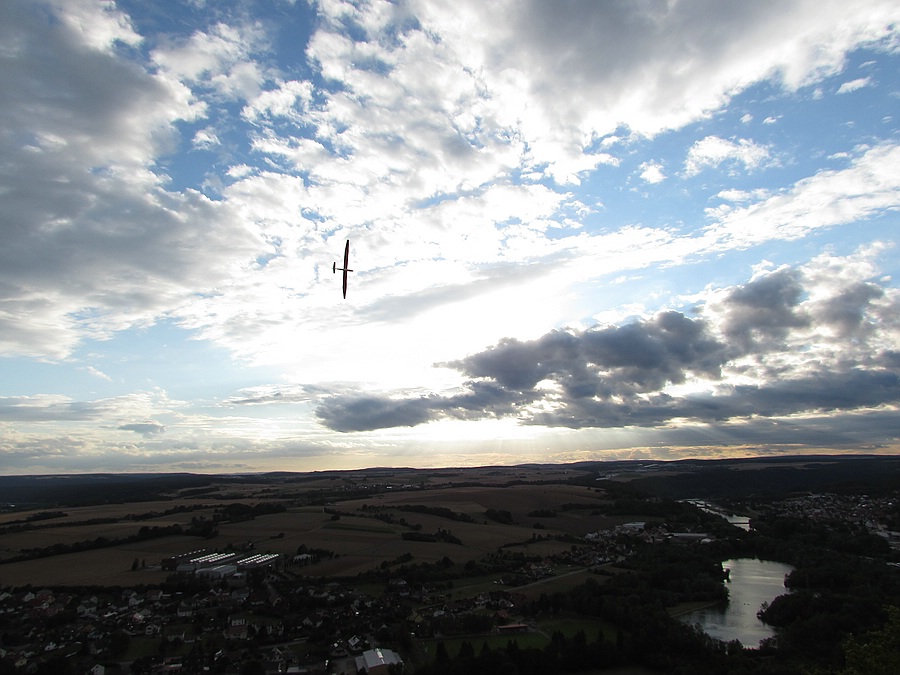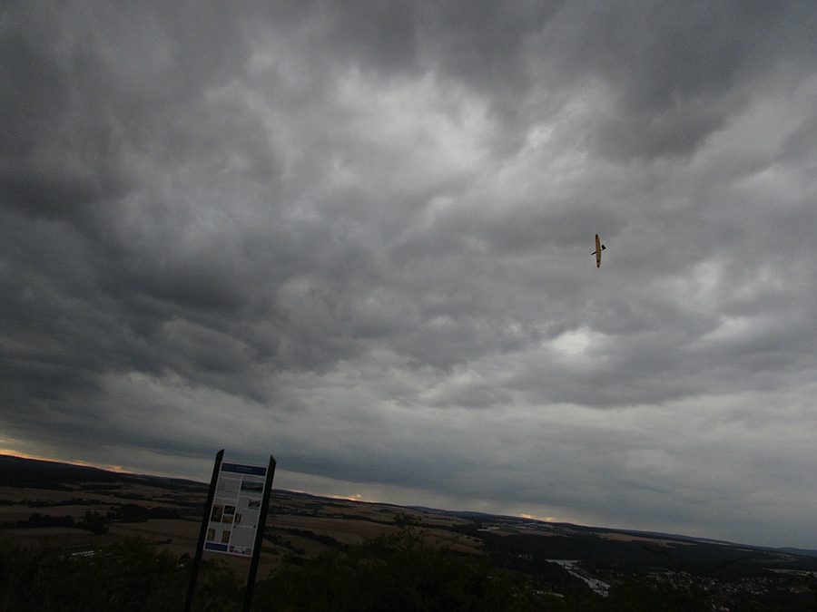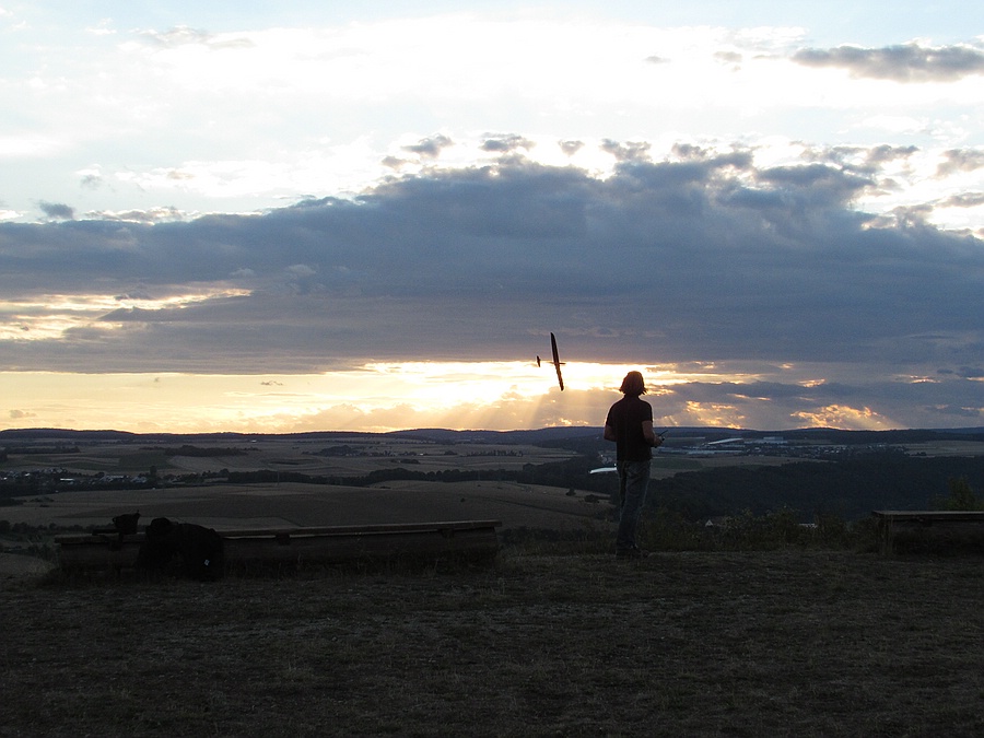 trug sehr gut, und es tat total gut mal den doofen Computer in der Uni zu lassen und wieder etwas Sonne zu tanken. Leider habe ich bei der letzten Landung kurz auf Fußgänger achten müssen, gerade als ich mit Lande-entwölb-dings-Querruder-halt-ganz-weit-hoch-wie-heißt-das-denn-bitte-richtig-Klappen recht niedrig war und eine reingebatscht bekommen habe. Kleiner ~1cm Riss am Rumpf.
