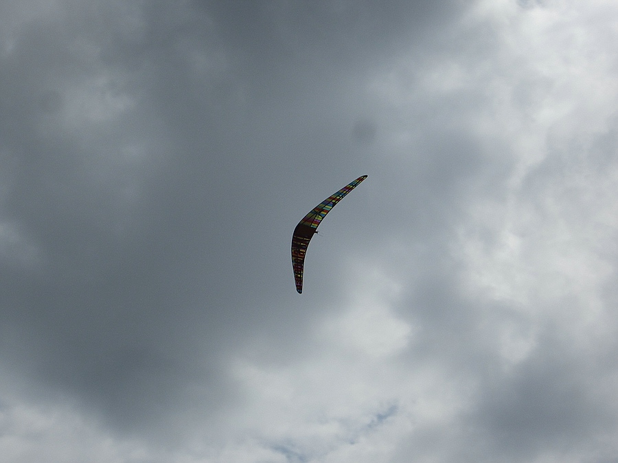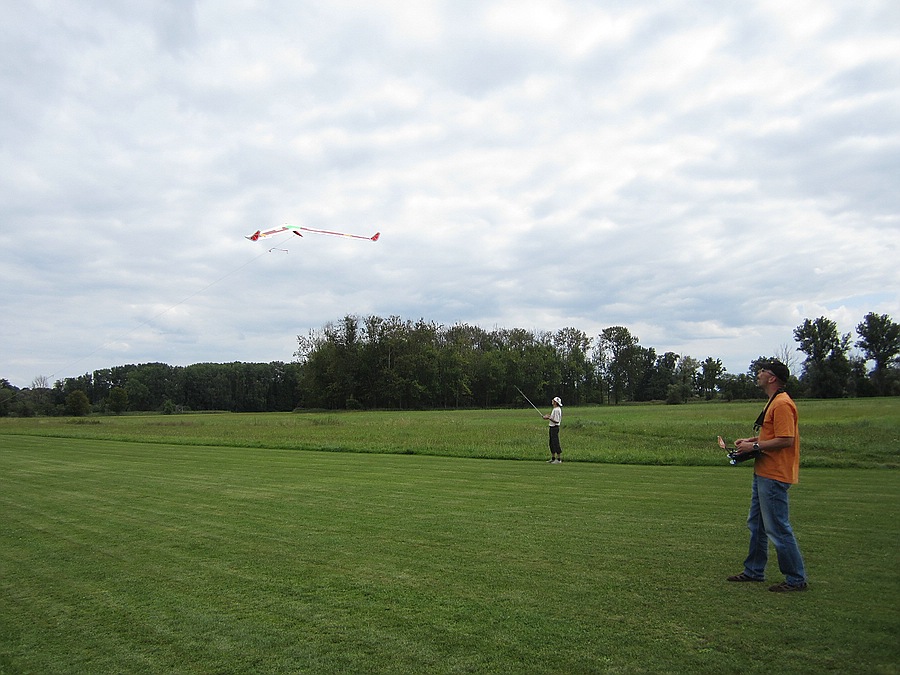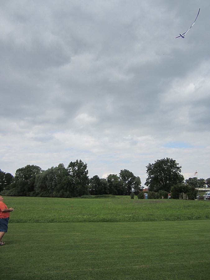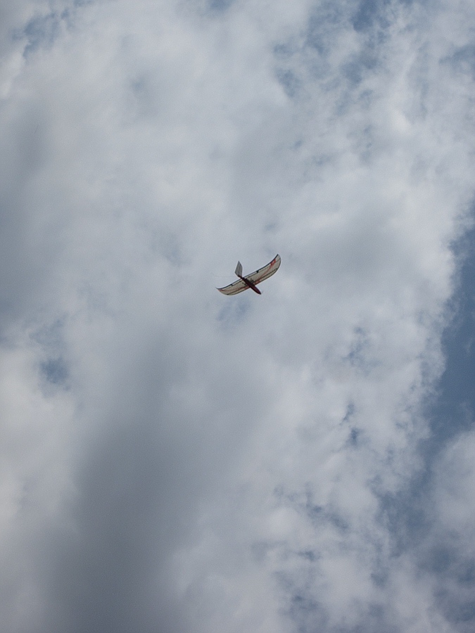 Ich habe dann mit bewußtem Überziehen in der oberen Steigphase Ausbrecher provoziert, die sich immer mit Höhenruder nachlassen und Gegenquerruder einfangen ließen. Bei einem Start kam zufällig eine Böe direkt von vorne, dabei habe ich sogar ein bisschen am Seil pendeln können.