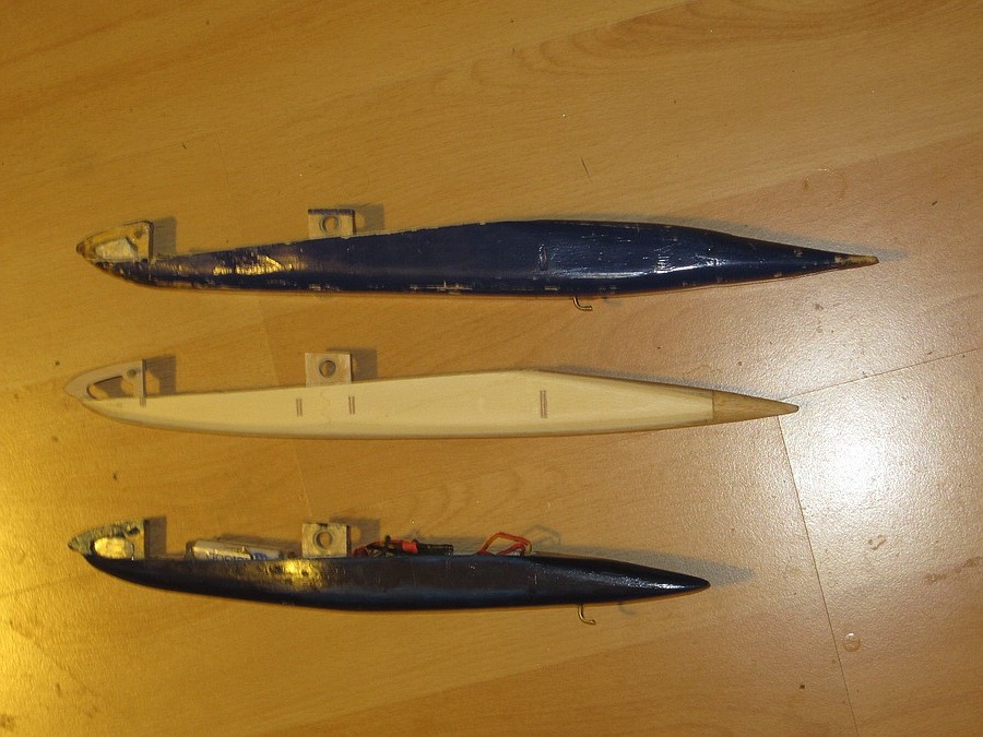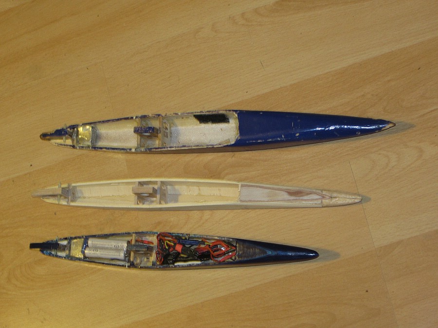 der neue schlanke Rumpf ist fertig incl. Lack, aber noch nicht mit Trimmblei, Schalter, Akku und Empfänger ausgebaut.